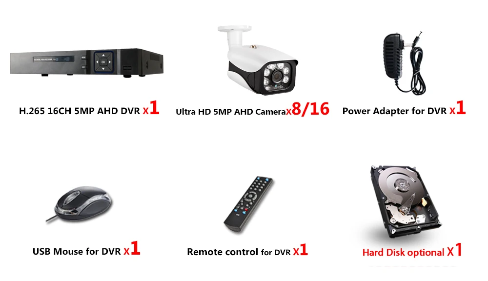 1 X 16CH H.265 AHD 5MP DVR NVR HVR 6 в 1 цифровой видеорегистратор;8/16 x HD 5.0MP Крытый Открытый ИК День ночного видения атмосферостойкие камеры;1 х адаптер питания для DVR;1 X USB мышь для DVR;1 пульт дистанционного управления для DVR;1 X CD программное обеспечение для DVRЖесткий диск опционально!
