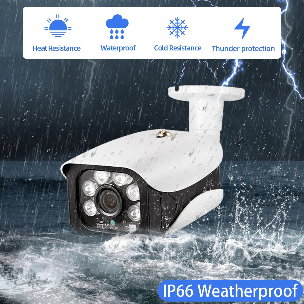 Используйте их в качестве наружных камер или крытых камер, так как они построены жестко, выдерживает любую погоду: дождь, снег, пыль и жаркие дни. С защитой от атмосферных воздействий IP66 и кабелями, просвечивающимися через подставку для защиты, гарантируем, что вы сможете ответить на их производительность, день в день. Наша камера имеет сверхпрочный металлический корпус, профессиональный IP66, устойчивый к атмосферным воздействиям, обеспечивая стабильную производительность как внутри, так и снаружи.