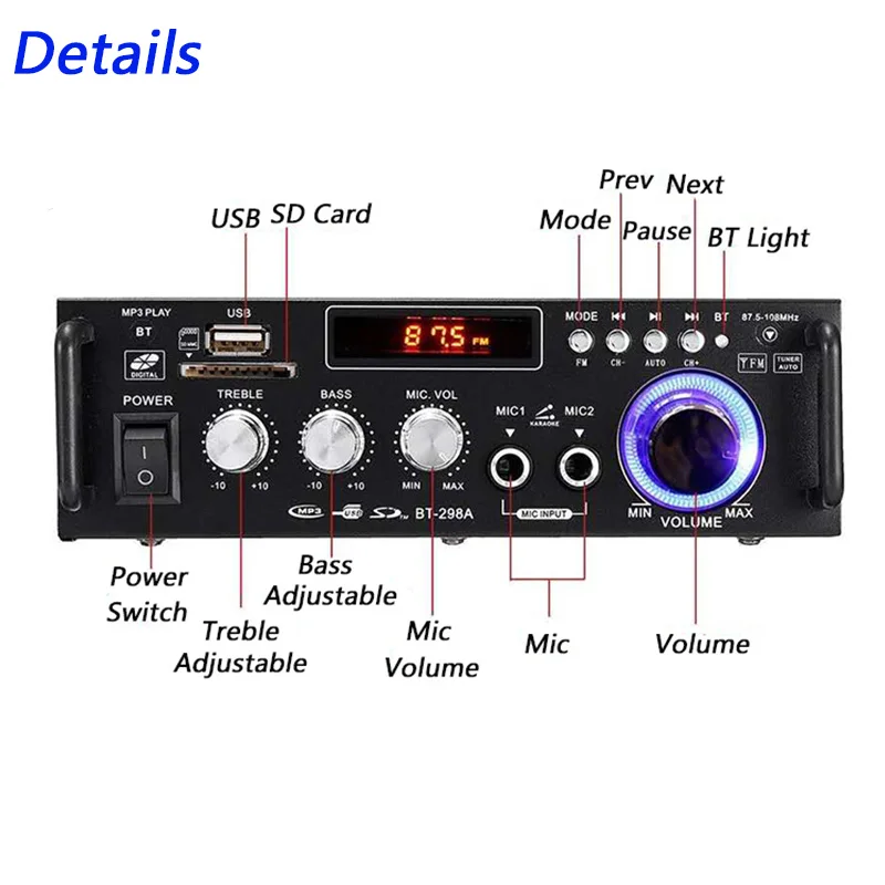 Усилитель звука bluetooth, 600 Вт, поддержка сабвуфера, 2 микрофона