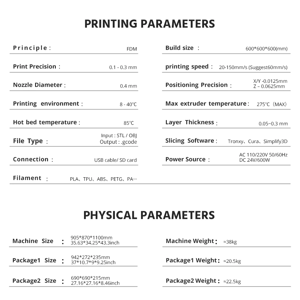 Основные характеристики:● Высокая точность печати (ось Z: 0,004 мм, ось XY: 0,012 мм)● Регулируемая функция оси X и оси Y● Используйте высокоскоростные направляющие колеса для обеспечения быстрой печати● Скорость печати: 20 - 300 мм/сек.● Используется алюминиевый профиль, прочный и износостойкий● Поддержка USB и sd-карт, отвечает различным требованиям● Операционная система: XP, WIN7, MAC● Рабочая среда: от-5 до 40 градусов Цельсия, влажность: от 20 до 80 процентовБренд: TronxyТип: сделай самЖК-дисплей: сенсорный экранМодель: X5SA-600Размер горячей кровати: 600*600 ммМатериал оправы: алюминийДиаметр сопла: 0,4 ммТемпература сопла: 170-275 градусовТолщина слоя: 0,1-0,4 ммКарта памяти офлайн печать: sd-картаСкорость печати: 20 -300 мм/сПоддерживающий Материал: ABS,HIPS,PC,PLA,PVC,Wood ,TPUТочность позиционирования оси XY: 0,012 ммТочность позиционирования оси Z: 0,004 ммНапряжение: 110 В/220 ВТип упаковки: Разобранная упаковкаРазмер бумаги: 600x600 ммПоддержка системы: XP, WIN7, MACТип разъема: sd-карта USB
