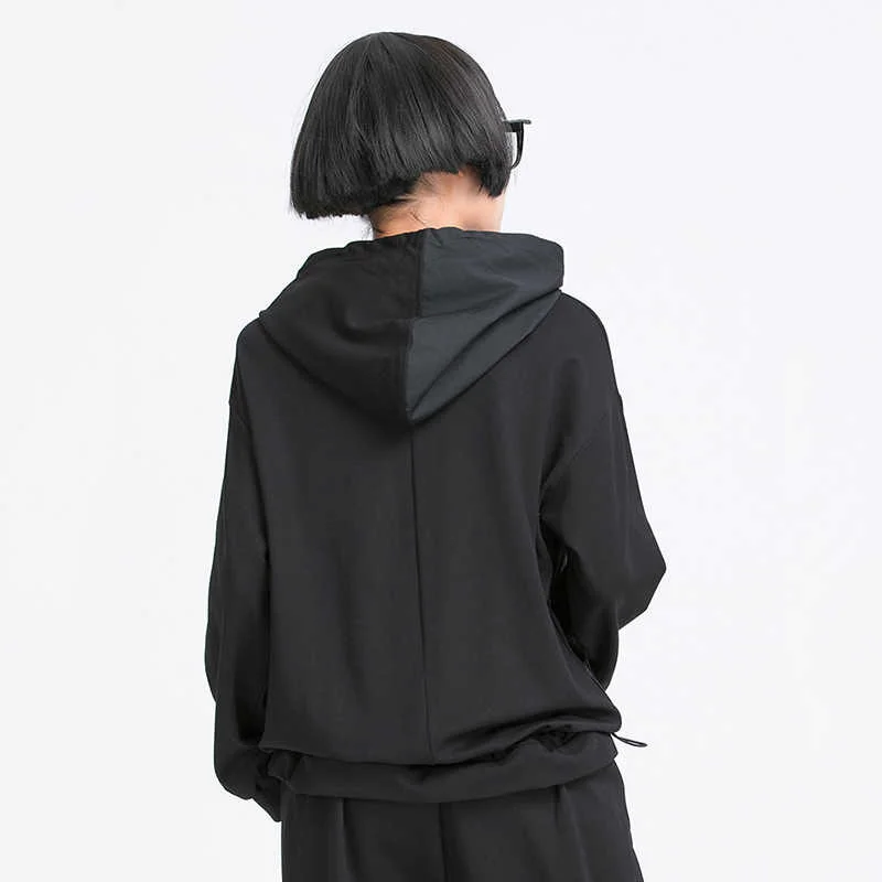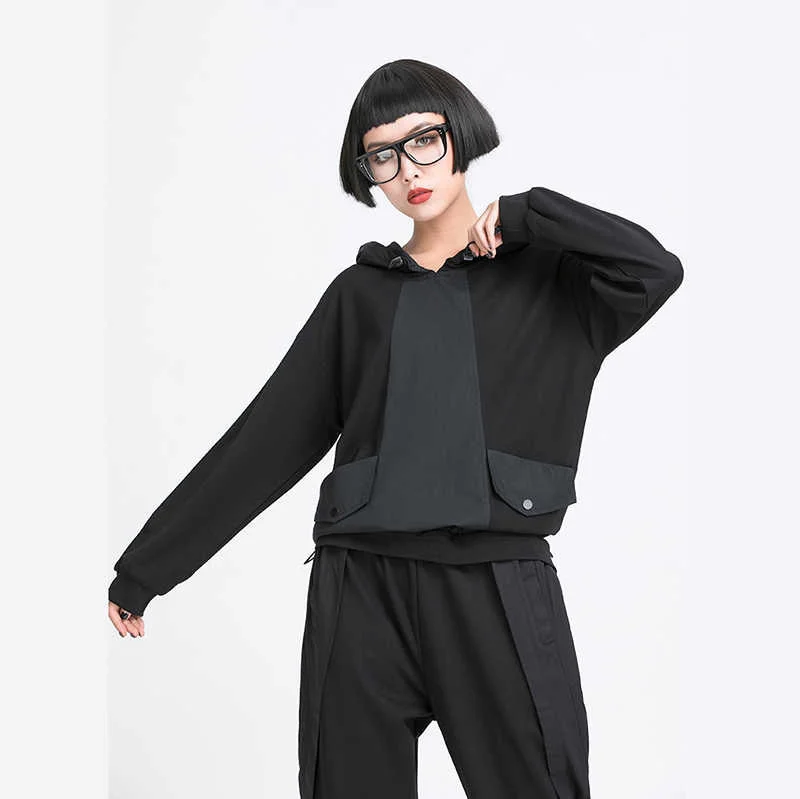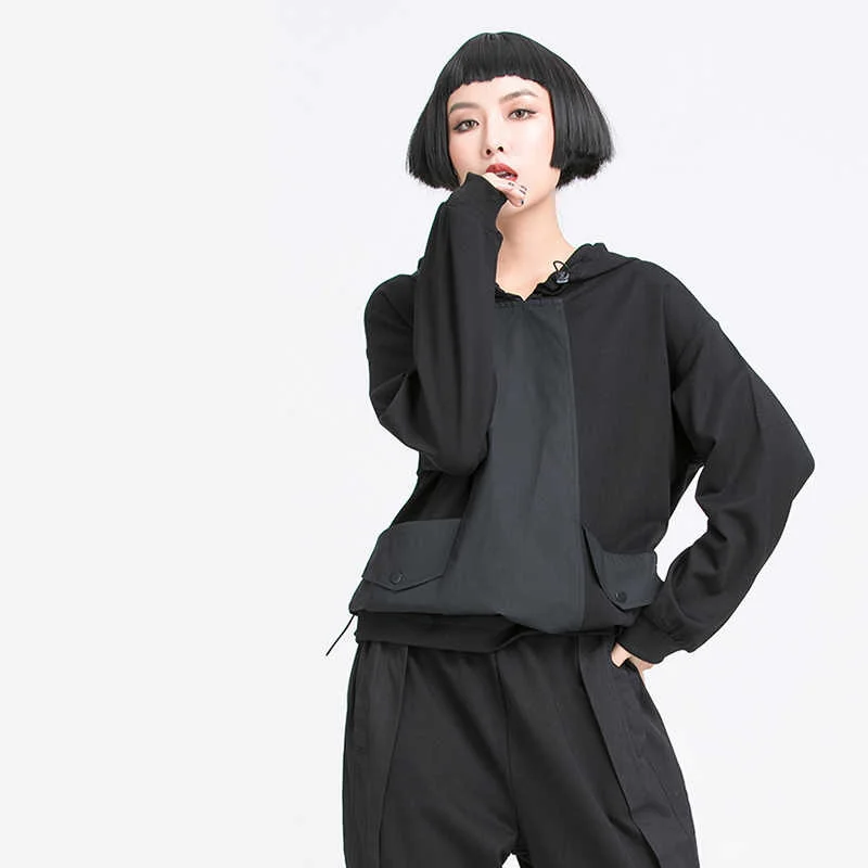 EAM Женская Черная футболка большого размера с карманами и шнуровкой, новая модная футболка с капюшоном и длинными рукавами, весна-осень 2022, 1Y772