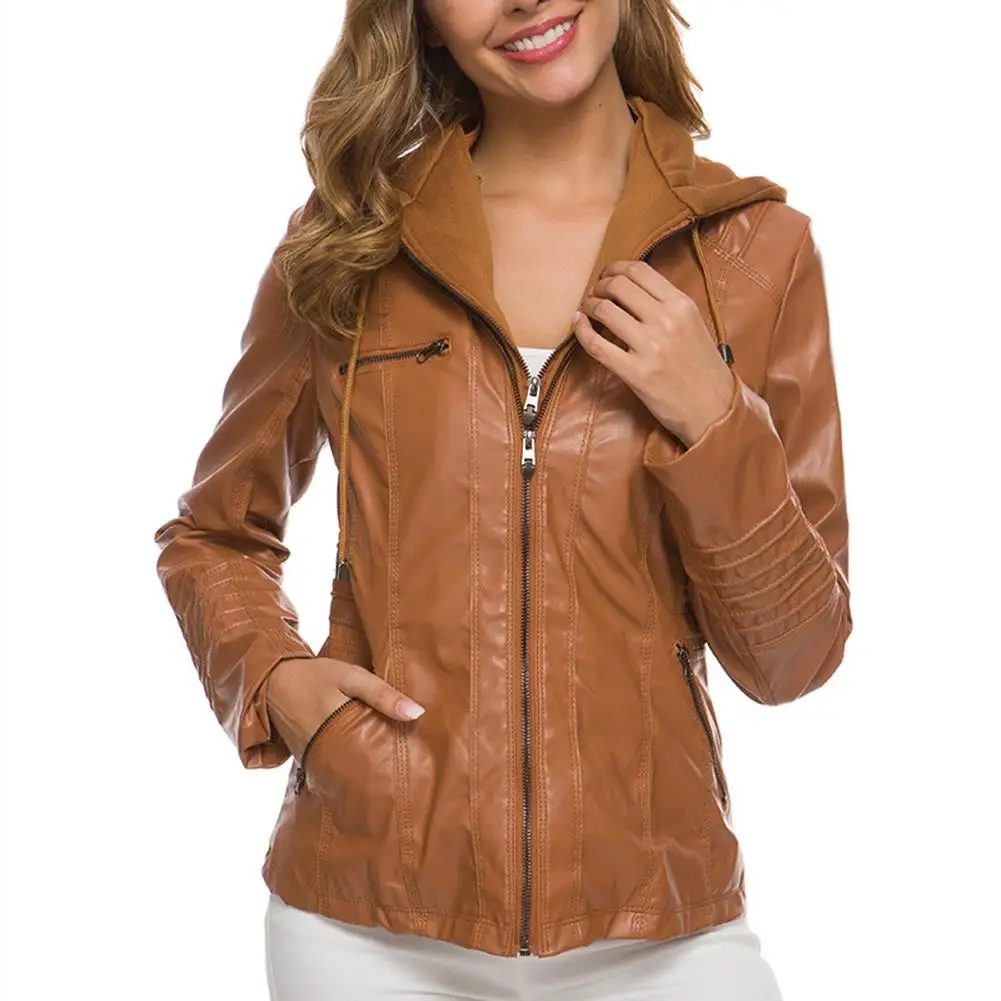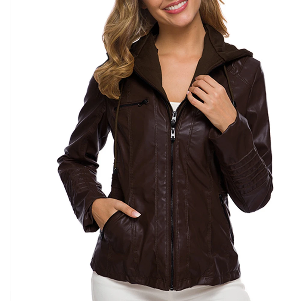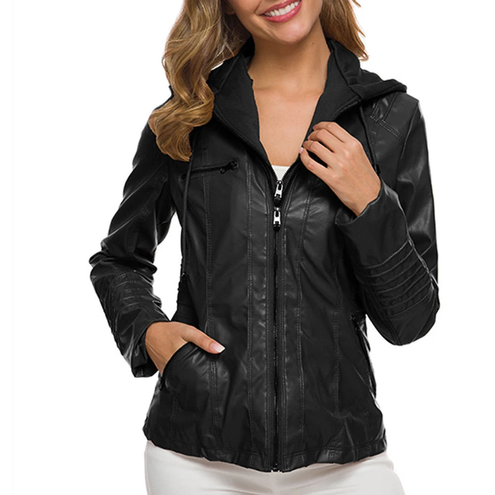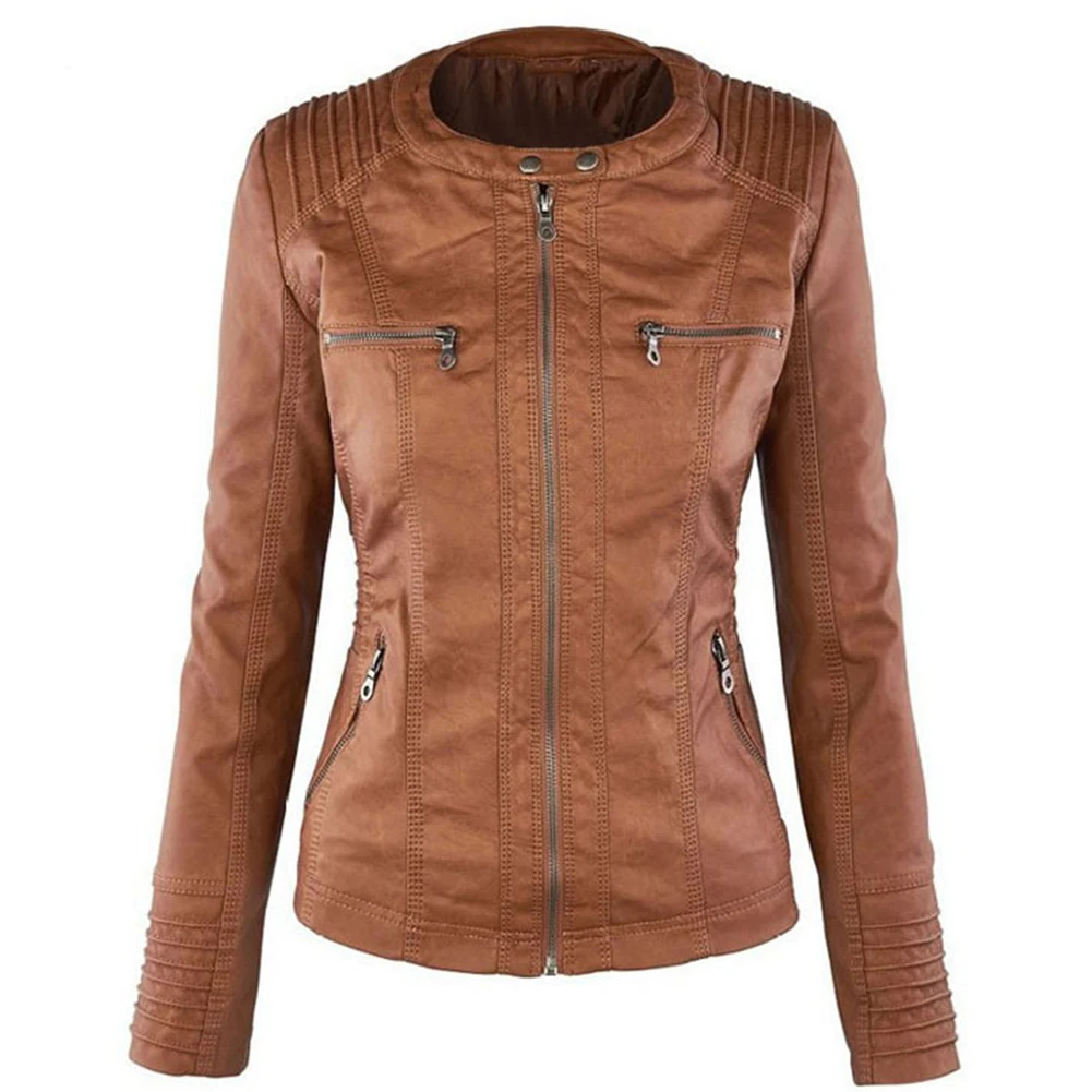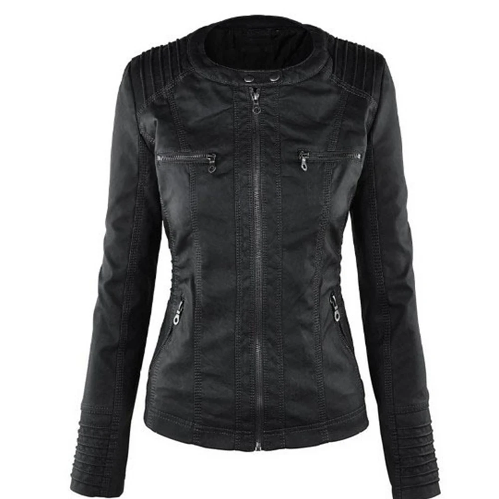 Женская куртка с карманами из искусственной кожи размера плюс, однотонная тонкая верхняя одежда на молнии