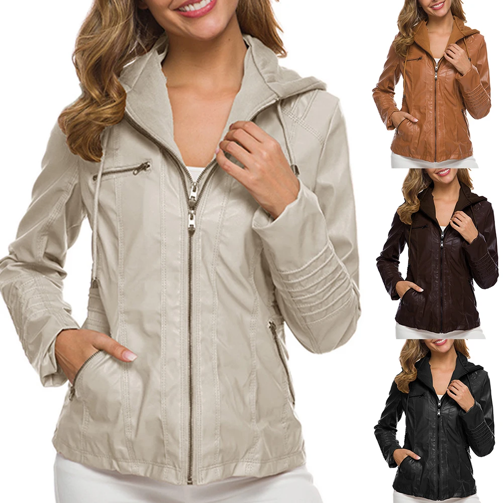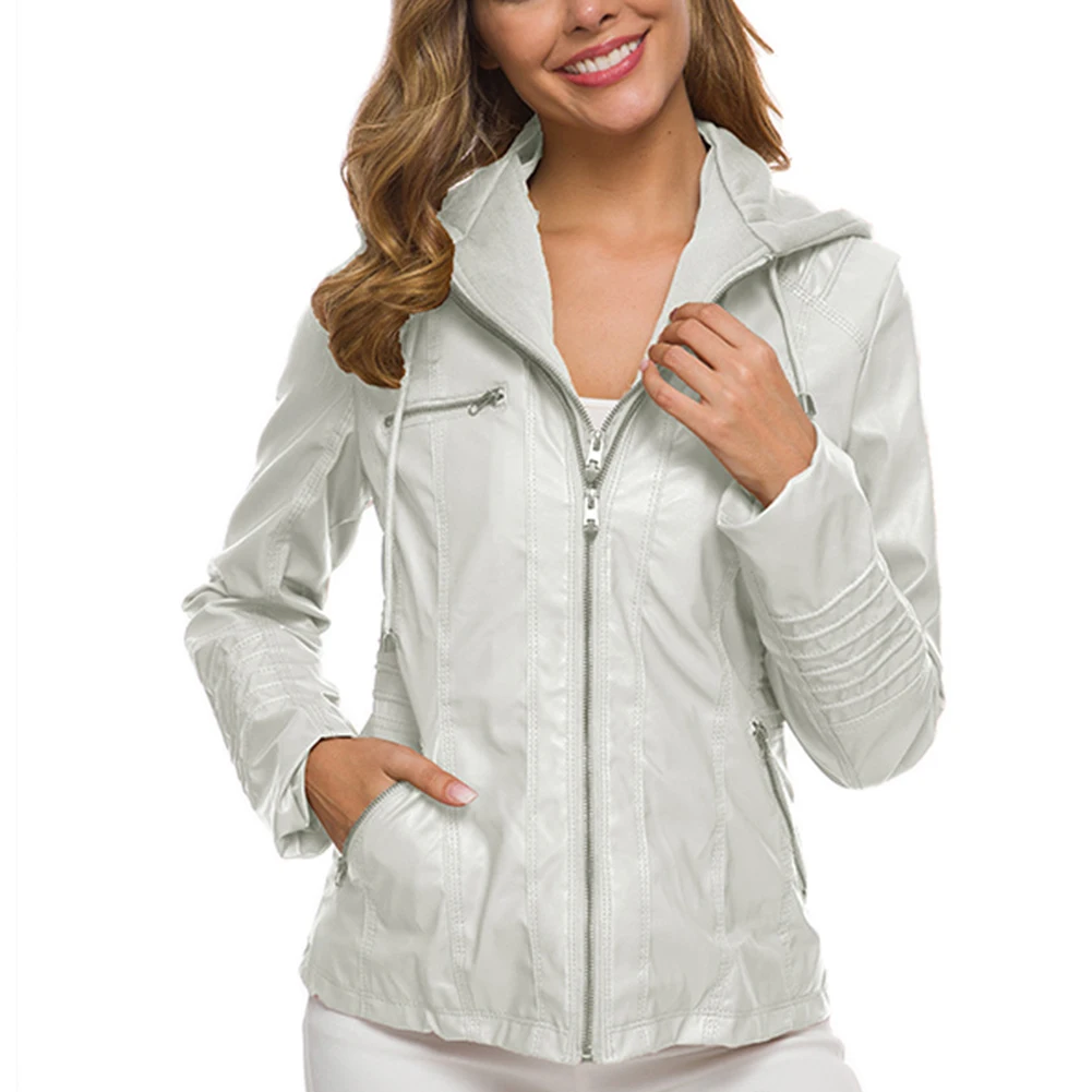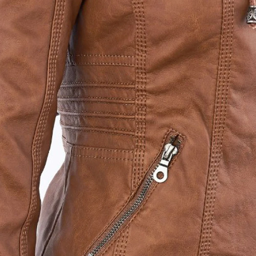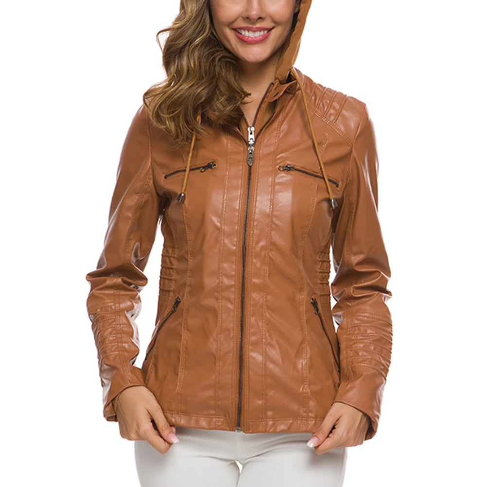 Женская куртка с карманами из искусственной кожи размера плюс, однотонная тонкая верхняя одежда на молнии
