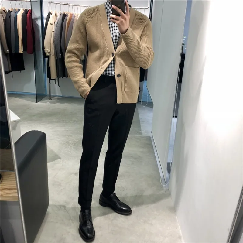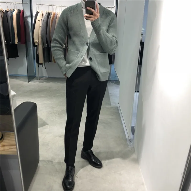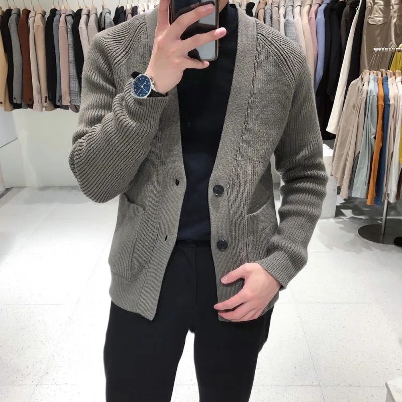 Мужской однобортный Кардиган, повседневный вязаный однотонный Кардиган с длинным рукавом и V-образным вырезом, с карманами, для зимы, 2021