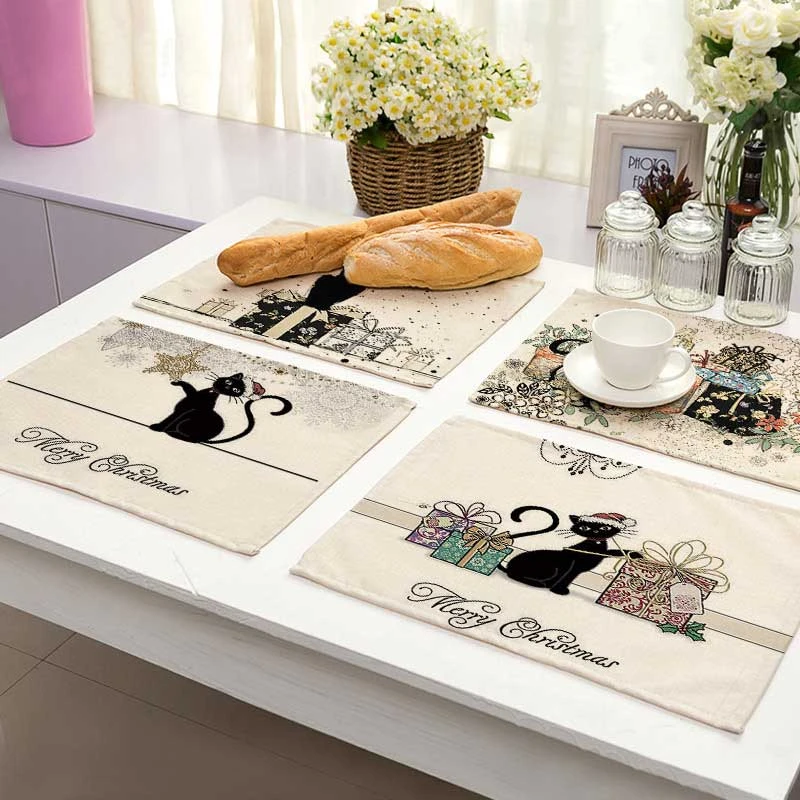 Bkack коврик из хлопка и льна с рисунком кошки, коврики для обеденного стола, подставка под чашку, коврик с рисунком, кухонная подставка 42*32 см, домашний декор MA0125