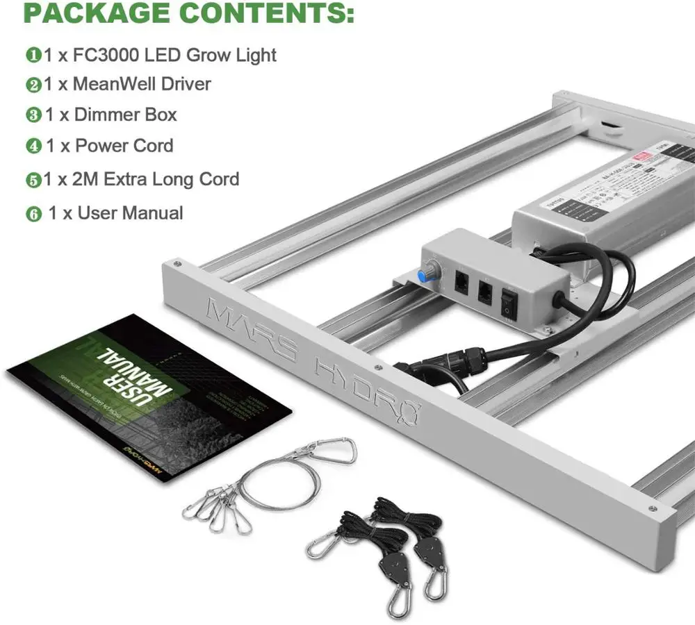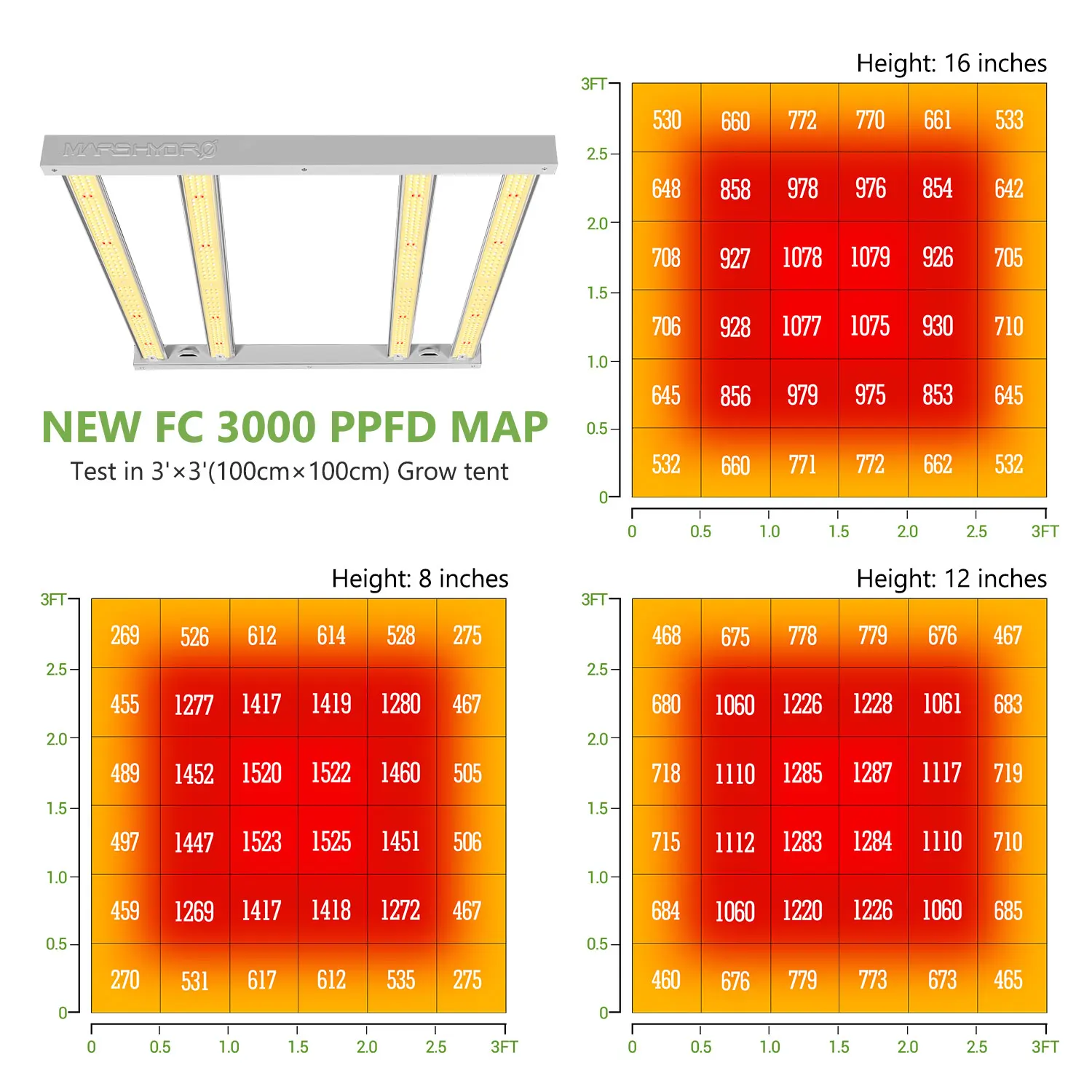 Модель: Mars Hydro FC 3000 led grow светильникКоличество светодиодов: 896 шт.Тип СВЕТОДИОДА: Samsung LM301D и Osram 660nmСпектр: 380-410nm, 650-665nm, 730-740nm, 2800-3000K, 4800-5000K,Фактическая мощность: 306 Вт ± 5% при AC120V, 297 Вт ± 5% при AC240V, 296 Вт ± 5% при AC277VAmp Draw: 2.455A @ AC120V1.230A @ AC240V1.078A @ AC277VЯдро покрытие: 3.5ft × 3.5ft = 1,1 м × 1,1 мМаксимальный охват: 4ft × 4ft = 1,2 м × 0,2 мPPFD: 827 мкмоль/m²sСветовой поток (± 5%): 53760Lm ± 5% @ AC120V ,53936Lm ± 5% @ AC240VЗаменяет HPS/MH: 400 ВаттСветильник Размеры: 58*52*82 см = 23*20*3,2 дюйм (ов)Вес нетто: 4,37 кг/9.6IBSУгол обзора светодиодов: 90 °/120 ° смешанныйВходное напряжение: 100-227 в (AC)Частотный диапазон: 56 ~ 60 ГцСрок службы: 50000-100000 часовУровень шума: 0 дБPPE: 2,8 umol/J 2,8 umol/s/w