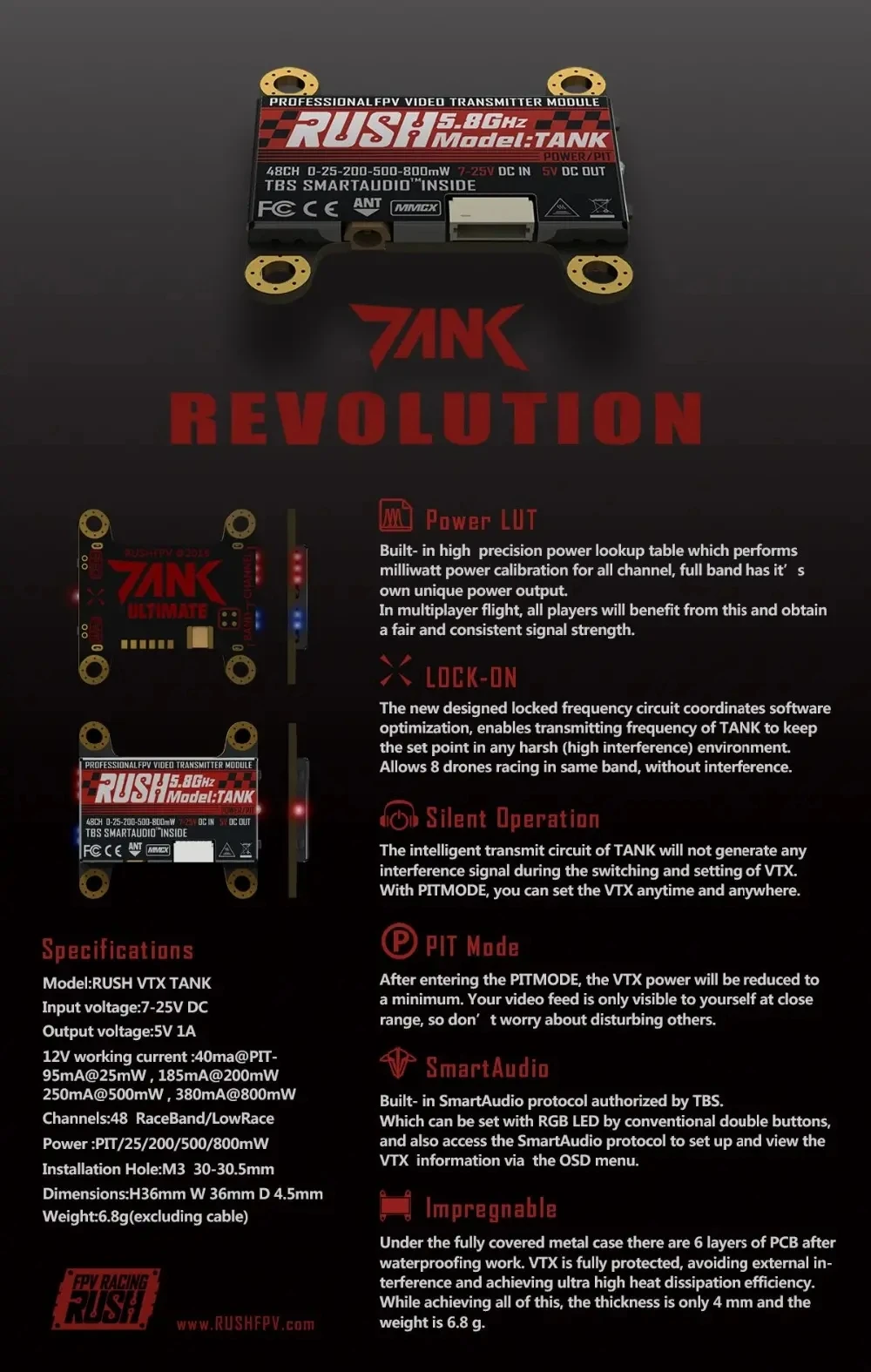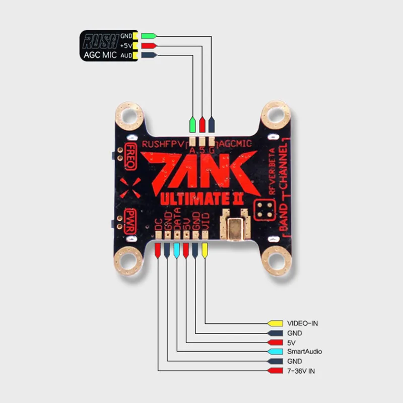 Наименование товара: Rush VTX TankВходное напряжение: 7-25 В постоянного токаВыходное напряжение: 5V 1AКаналы: 48CHМощность: PIT/25/200/500/800 МВтМонтажное отверстие: M3Размеры: 36*36*4,5 ммВес: 6,8 г (включая кабель)