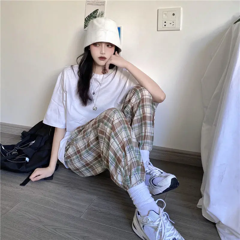 Брюки женские летние, широкие, в клетку, с высокой талией, с карманами
