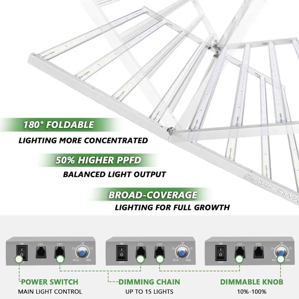 4. Бум выход и повышение качества урожаяМодернизированный sunlike полный ассортимент, высокая PPFD при температуре не выше 2,8 мкмоль/j, средняя доходность на 2,5 g/w, повышаем вашу выход 50% или больше по сравнению со старым blurple и HPS lights.180 ° Складная, легкая установка опции, позволяет расти с уверенностью.