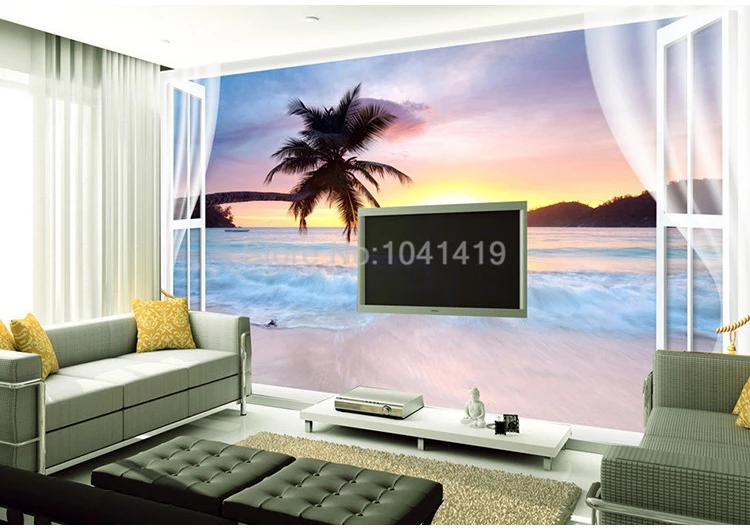 Пользовательские обои любого размера, 3D Приморский Пейзаж, кокосовое дерево, окно, настенная живопись, гостиная, ТВ, диван, водонепроницаемый 3D стикер