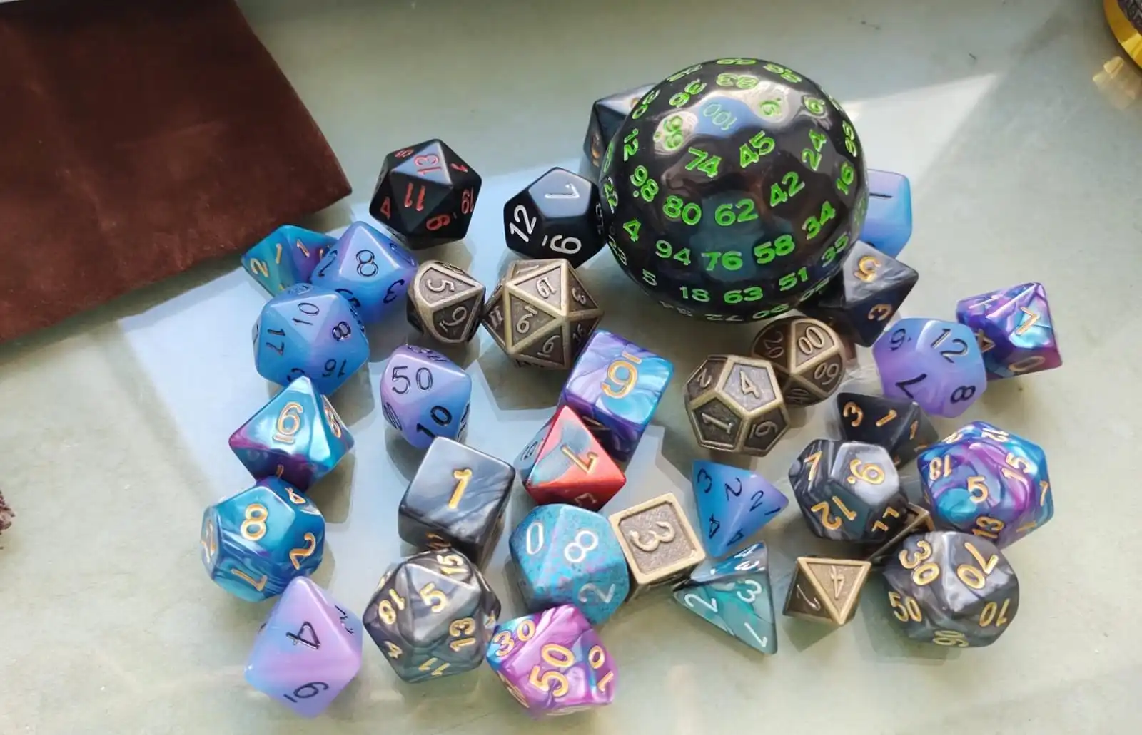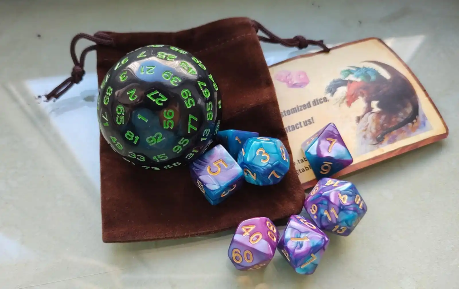 Мне нравится зеленый цвет, он очень заметен на черном, поэтому не трудно заметить цифры. Я также получил Небольшой коричневый мешок для кости, шляпа подходит к этой кости и может подойти к другому набору, который, как я думал, был действительно хорош. Прибыло около месяца в хорошем состоянии.