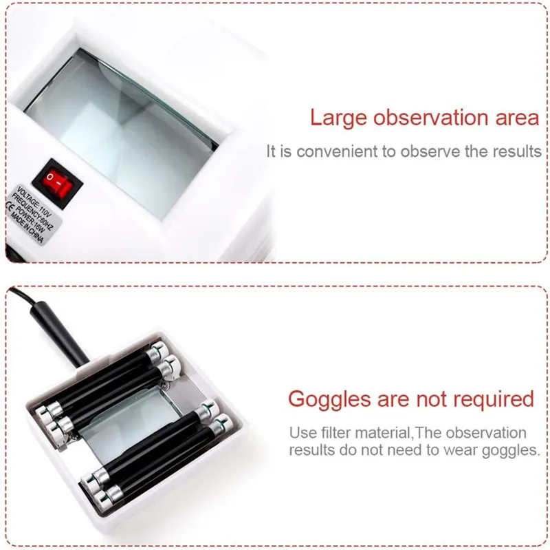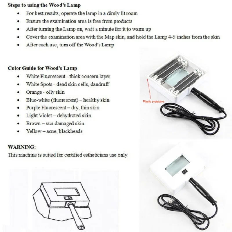 1. Анализатор кожи для экзамена: Наш анализатор кожи использует УФ-светильник для диагностики состояния кожи, является лампой для исследования и диагностики типа кожи для правильного лечения лица. 2. Как это работает: Таблица, меланин дермы и коллаген дермы могут производить синюю флуоресценцию после поглощения определенной длины волны ультрафиолетового светильник, который зависит в основном от кожи и дермы. Флуоресценция, вызванная различными условиями здоровья кожи, также меняется. Таким образом, состояние кожи, которое не распознается невооруженным глазом, например, сухое, жирное или старение, может быть выявлено при воздействии на ультрафиолетовый светильник. 3. Безопасный УФ увеличивающий анализатор: этот вид Длинноволнового УФ очень безопасен и безвреден для пациентов и докторов 'Кожа и глаза. Напротив, умеренное облучение может помочь в обработке экзогенных пятен, акне и других проблем с кожей. 4. Как использовать: легко использовать. Когда лицо помещается в затемняющую ткань на задней части инструмента, доктор или косметология могут наблюдать состояние кожи объекта через линзу спереди, И состояние кожи можно оценить, сравнив флуоресцентную цветовую таблицу. 5. Надежный: помогает подвергать воздействию различных веществ кожи под ее фиолетовыми лучами, это сложный метод анализа кожи, обнаруживает различные виды заболеваний кожи