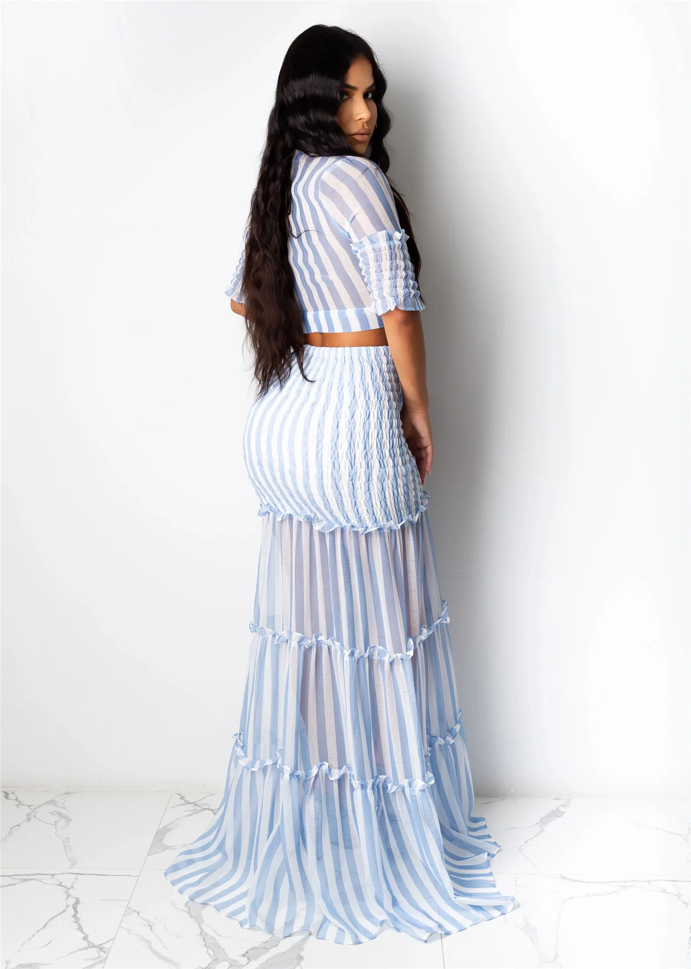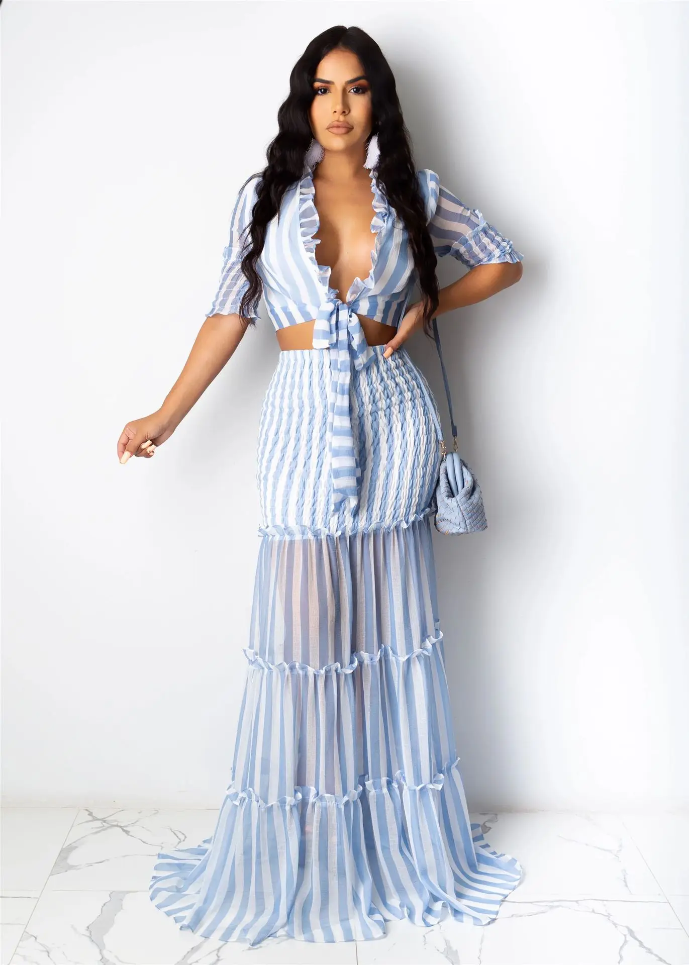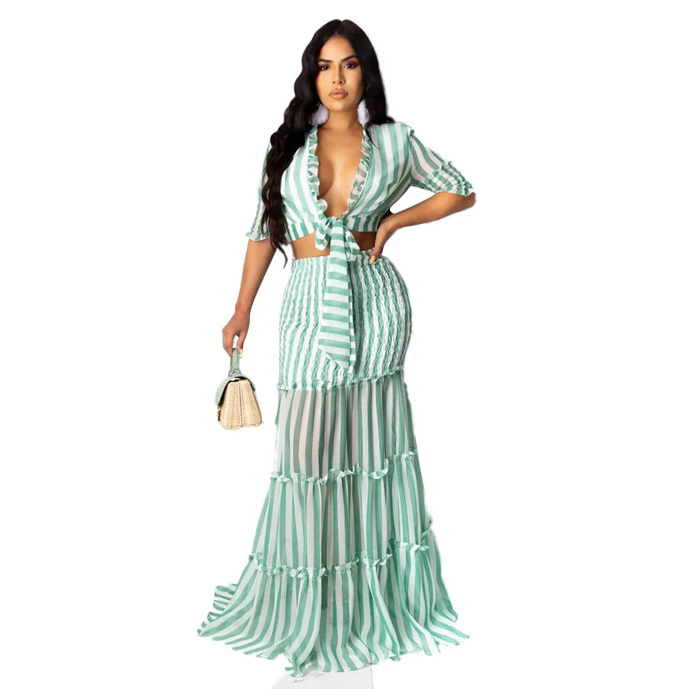 Повседневный прозрачный сетчатый лоскутный комплект Adogirl из двух предметов, платье, Осенний полосатый шифоновый укороченный топ на шнуровке с грибком, макси-юбка, пляжный костюм