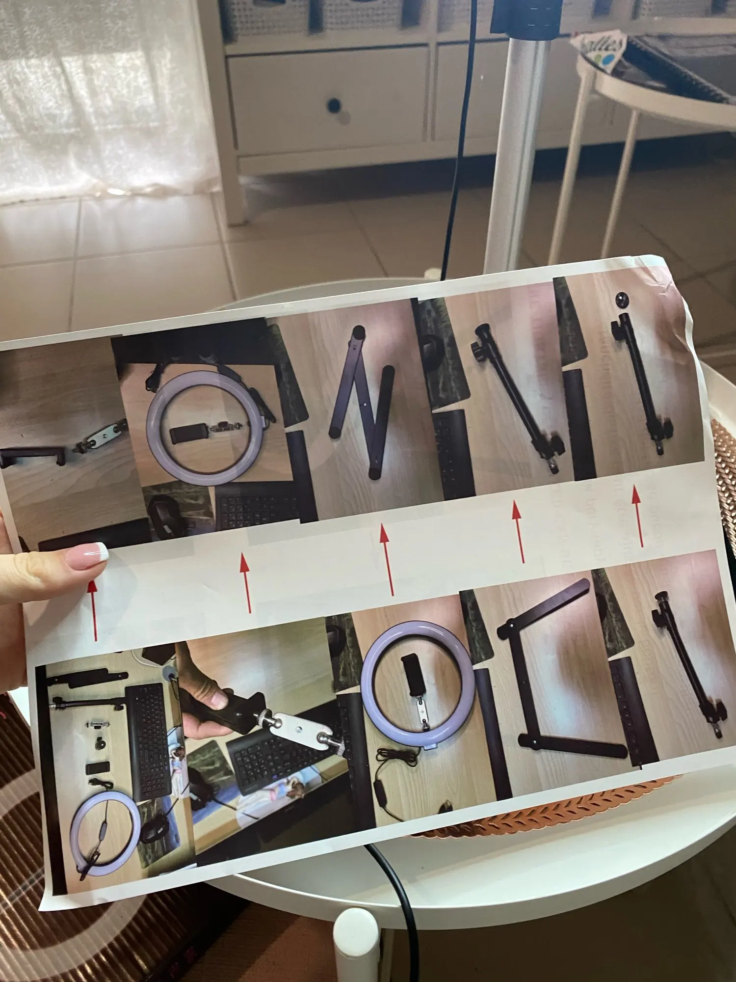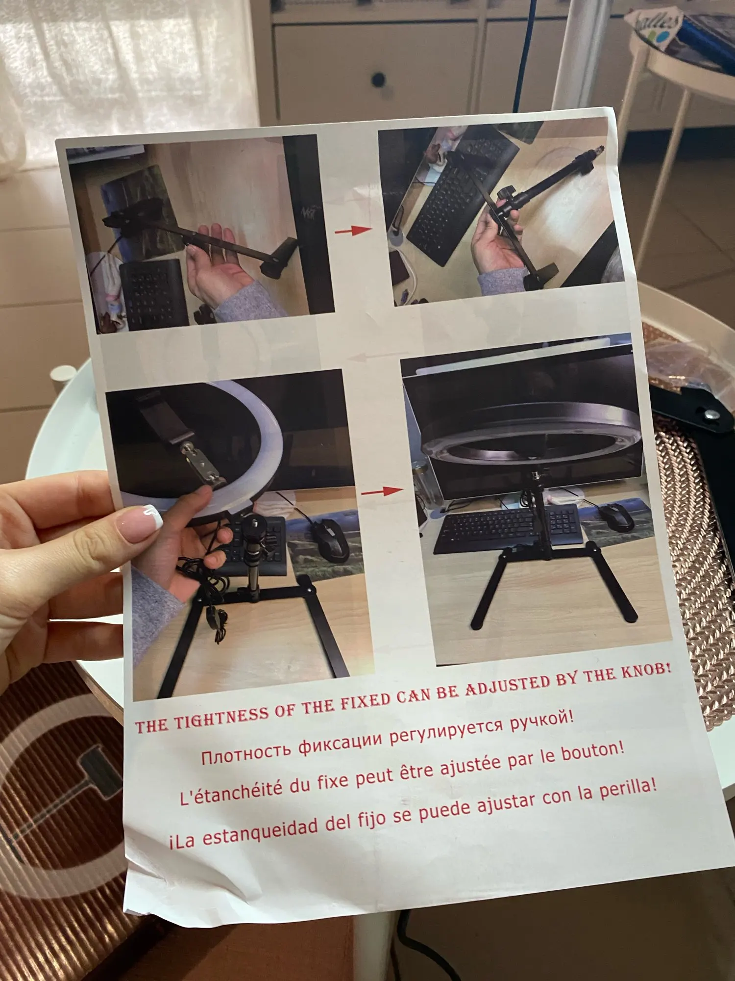 товар дошел за месяц. отслеживался. пришел в ооочень мятой коробке. внутри все целое. есть инструкция по сборке в виде картинок. штатив достаточно тяжелый-выглядит надежно, есть сомнения насчет запчасти, которая держит телефон(у меня тяжелый-наверно будет наклонятся). в остальном все отлично. у лампы 3 режима света