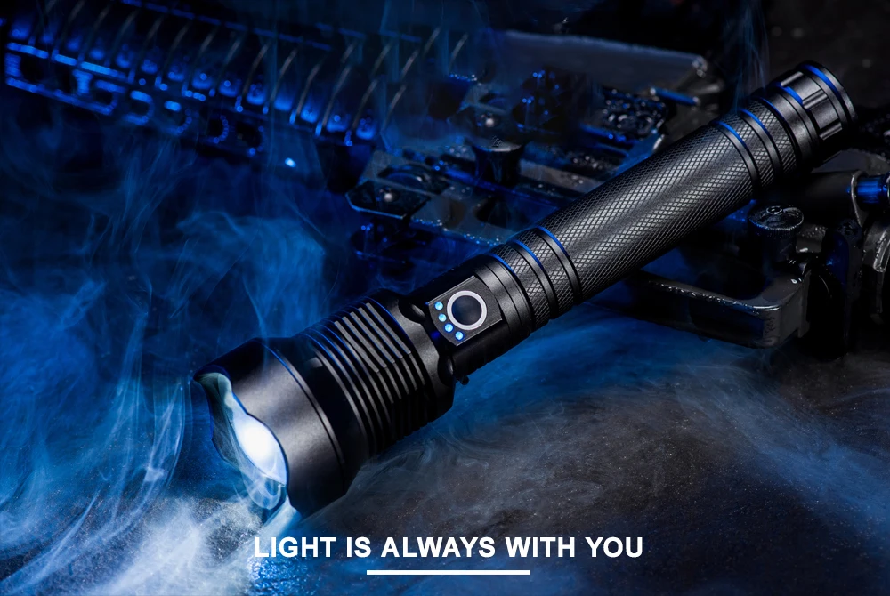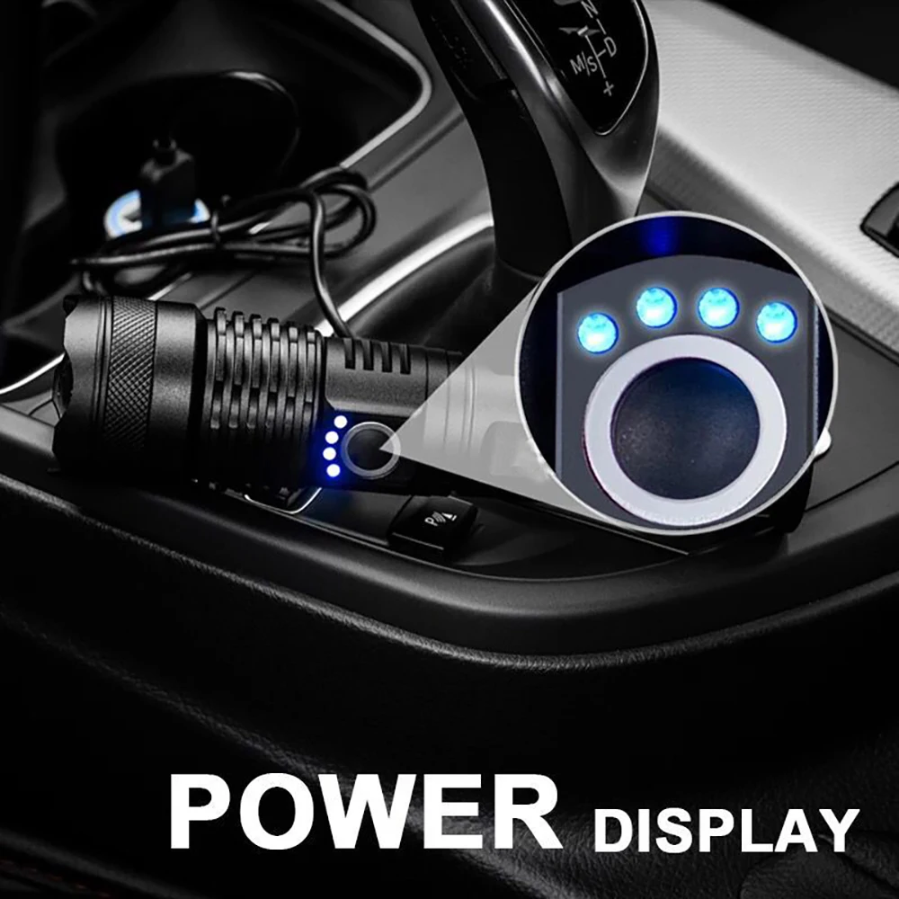 Этот фонарик имеет функцию отображения мощности. Он отображает четыре синих фонаря, когда аккумулятор полностью заряжен. При недостаточной мощности лампа мигает. Удобно знать использование энергии в любое время и в любом месте.