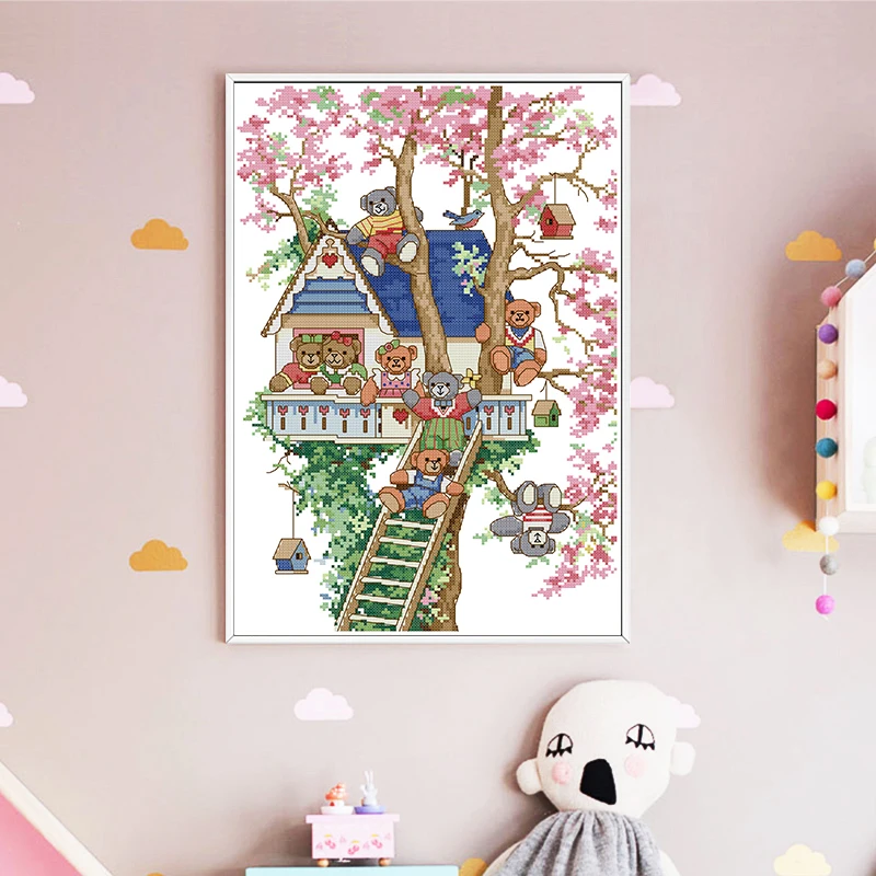 Схема для вышивки крестиком с изображением домика медведя на дереве, 14CT, 11CT, счетная набивная ткань для рукоделия, набор для рукоделия