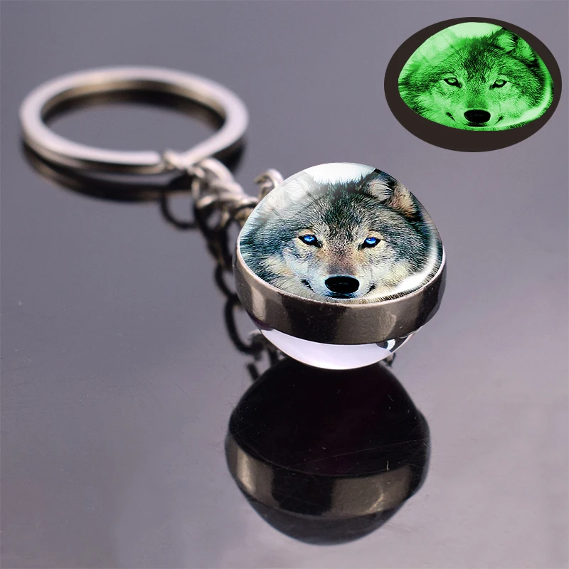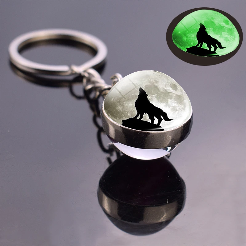 Светящийся брелок в виде волчьей Луны со стеклянным шариком, подвеска в виде головы волка, светится в темноте держатель для ключей, подарок на Рождество для мужчин и женщин