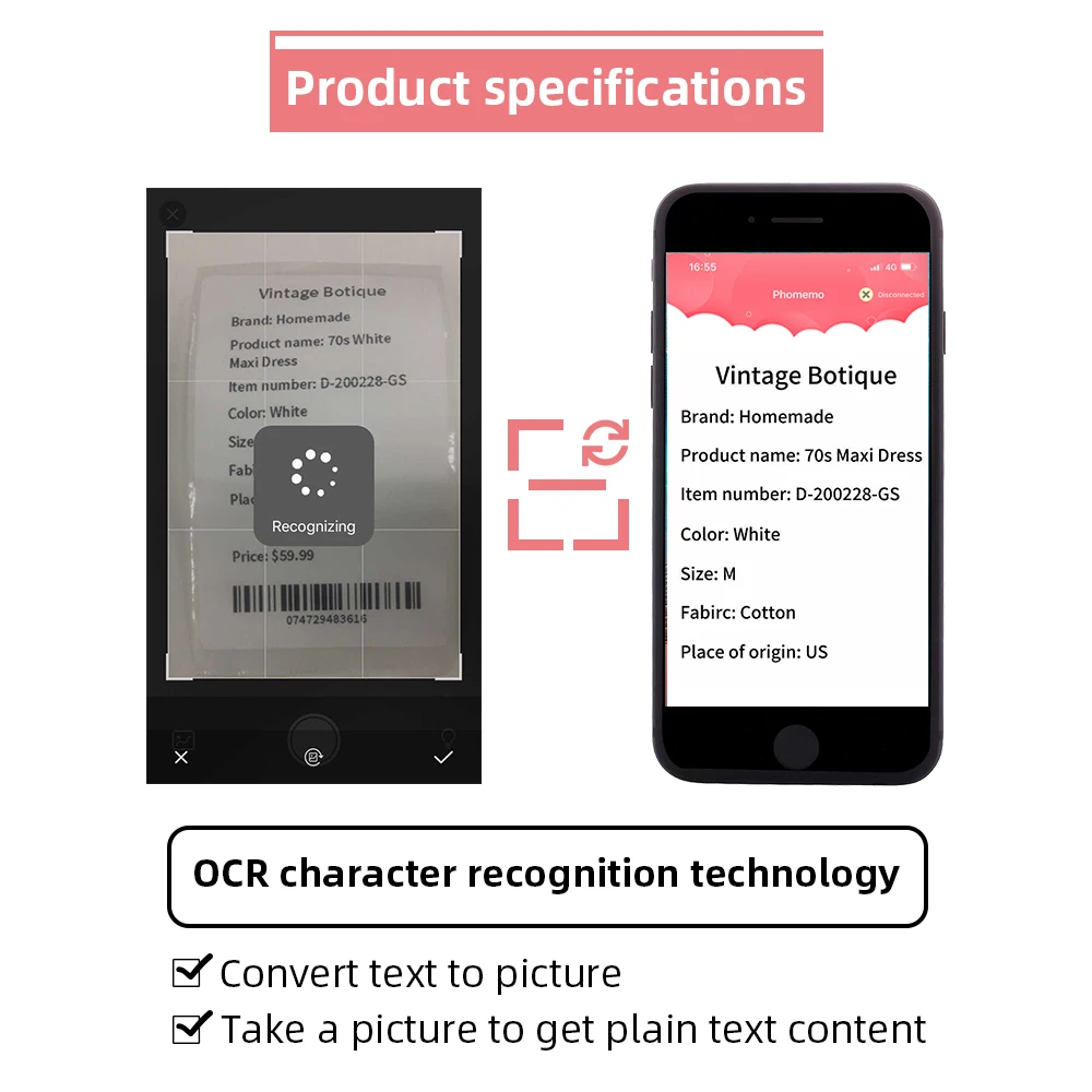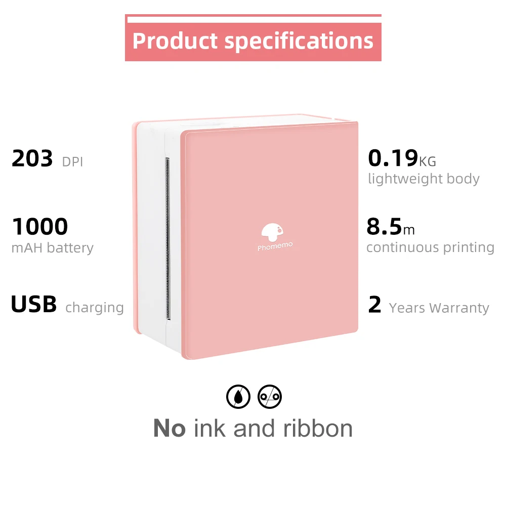 Информация о продукте:Размеры изделия:M02:84 мм × 81 мм × 40 ммM02S:84 мм × 84 мм × 42 ммВес изделия: 200 гБатареи: требуется 1 Литий-полимерный аккумулятор. (в комплекте)Емкость аккумулятора: 1000 мАчМаксимальное разрешение: 203 точек/дюйм (M02)/300 точек/дюйм (M02S)Тип интерфейса: Совместим с bluetoothПоддержка сетевой печати: нет