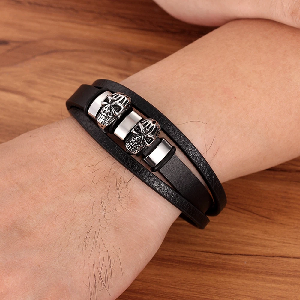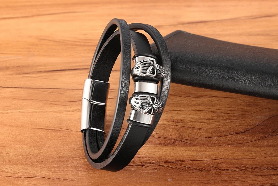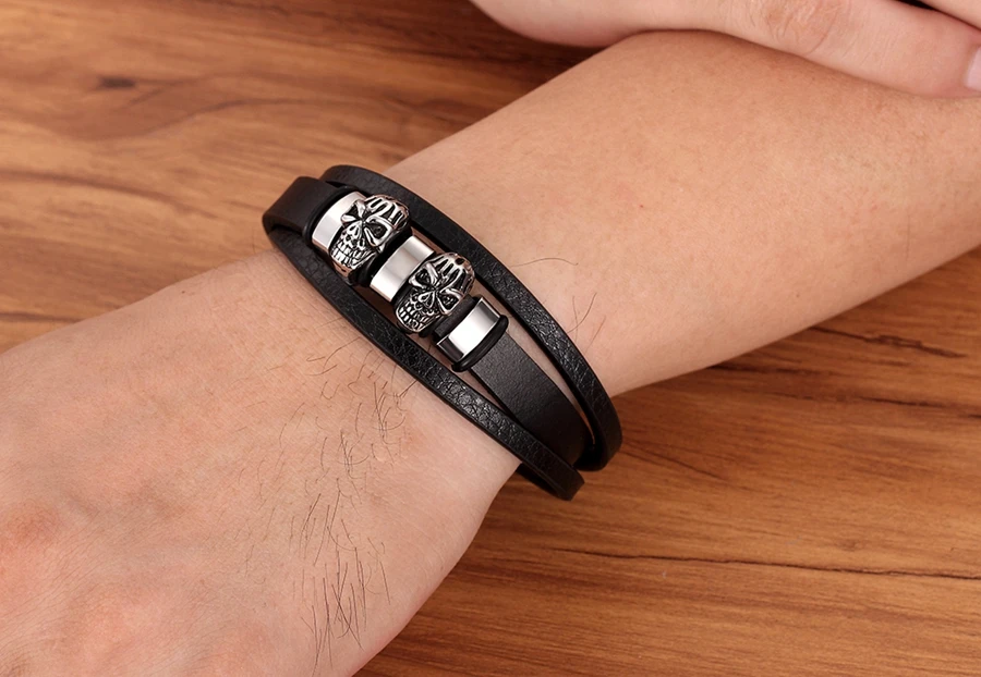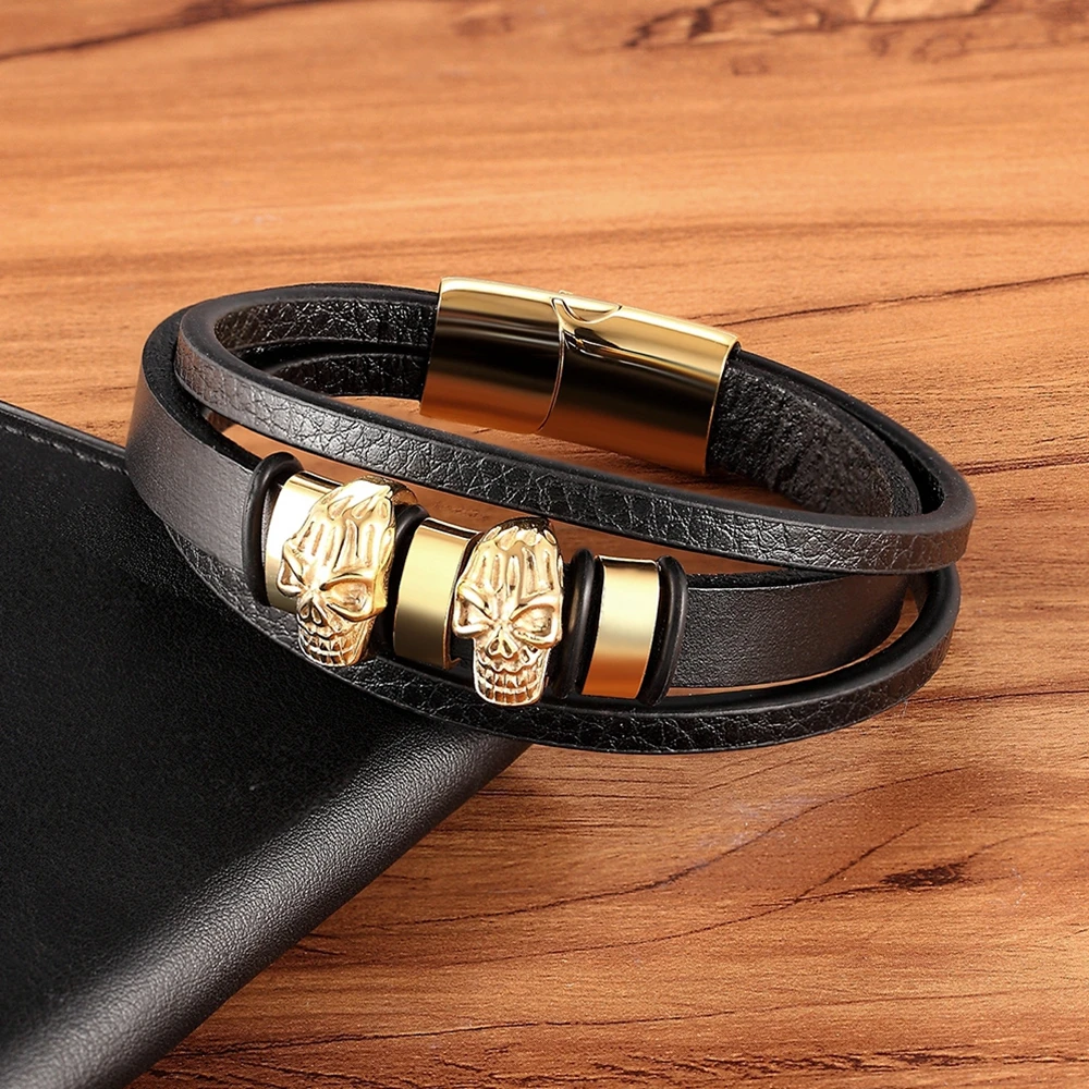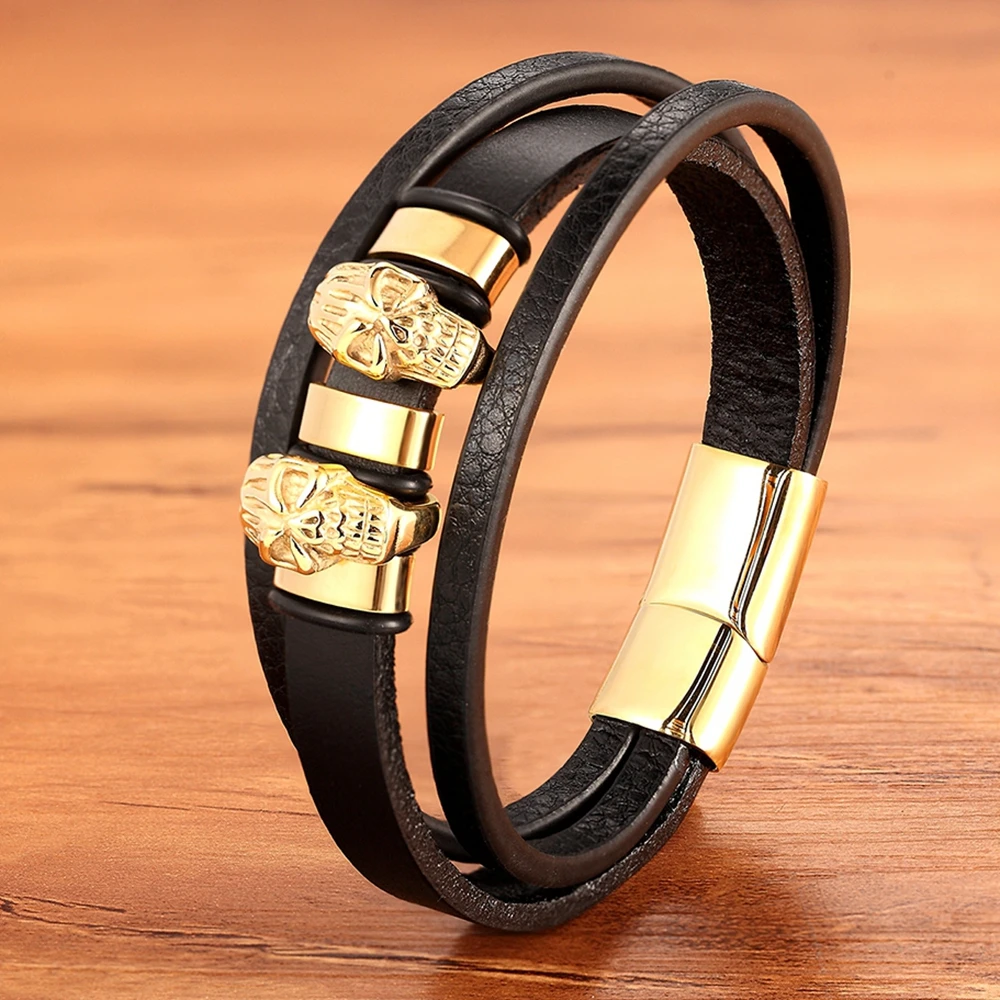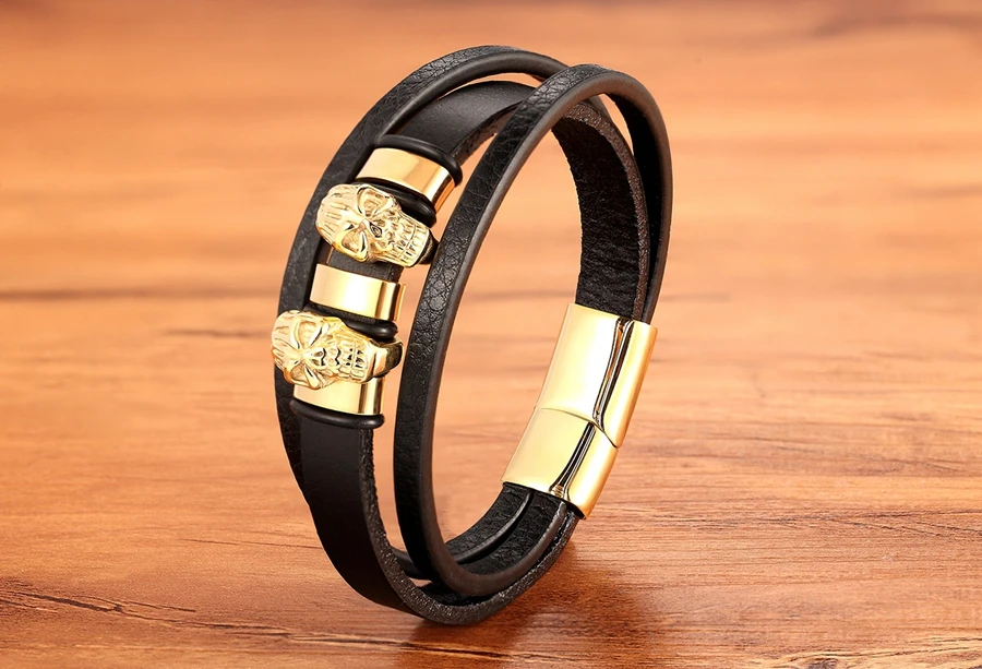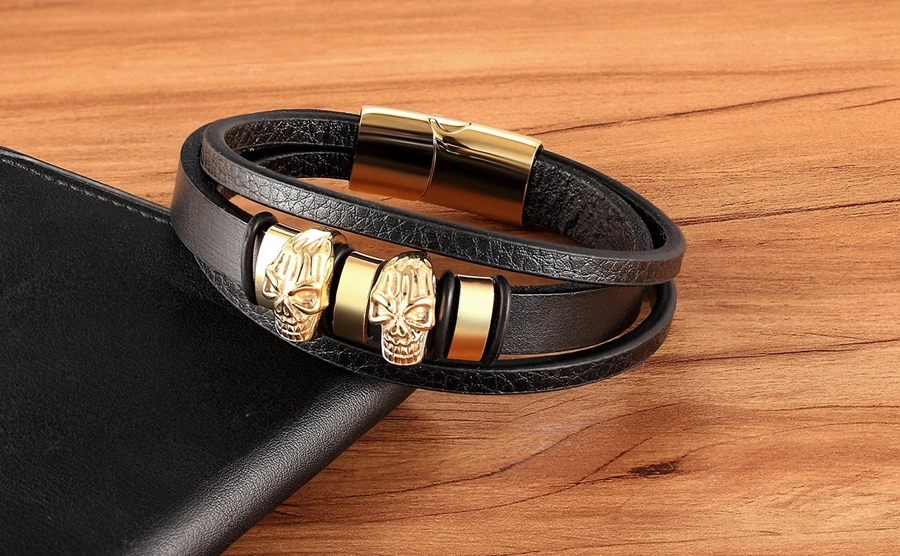 Браслет мужской кожаный, аксессуар с изображением черепа из нержавеющей стали, ручная работа, магнитная застежка, Подарочный аксессуар золотого цвета