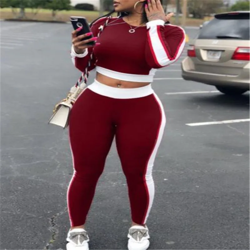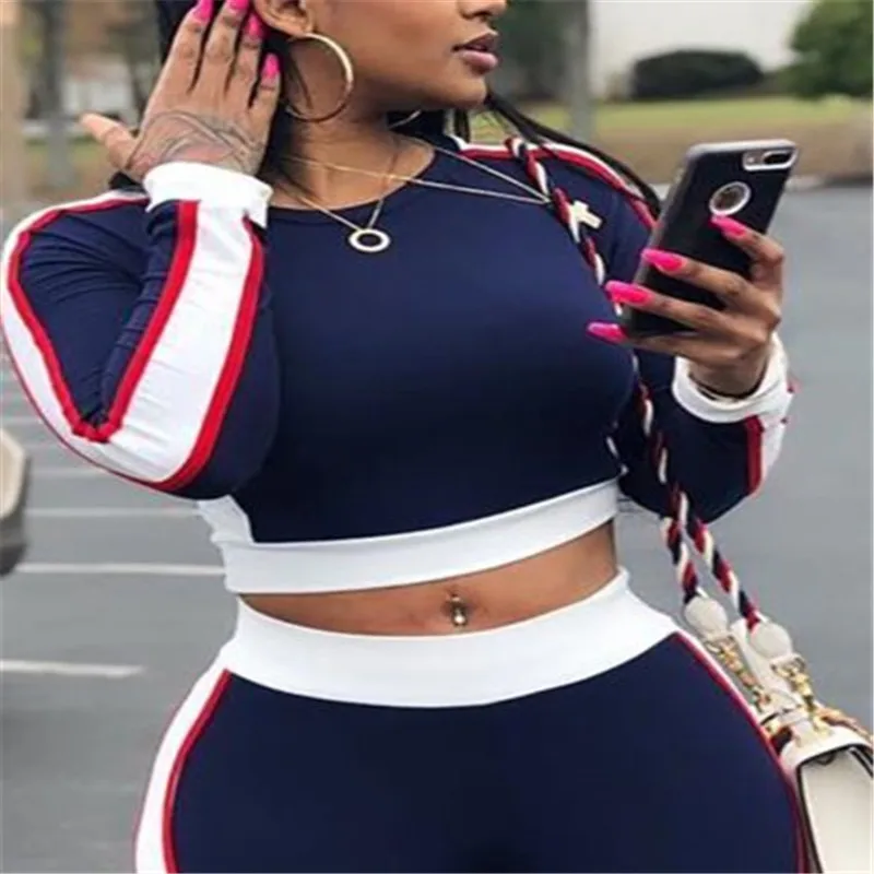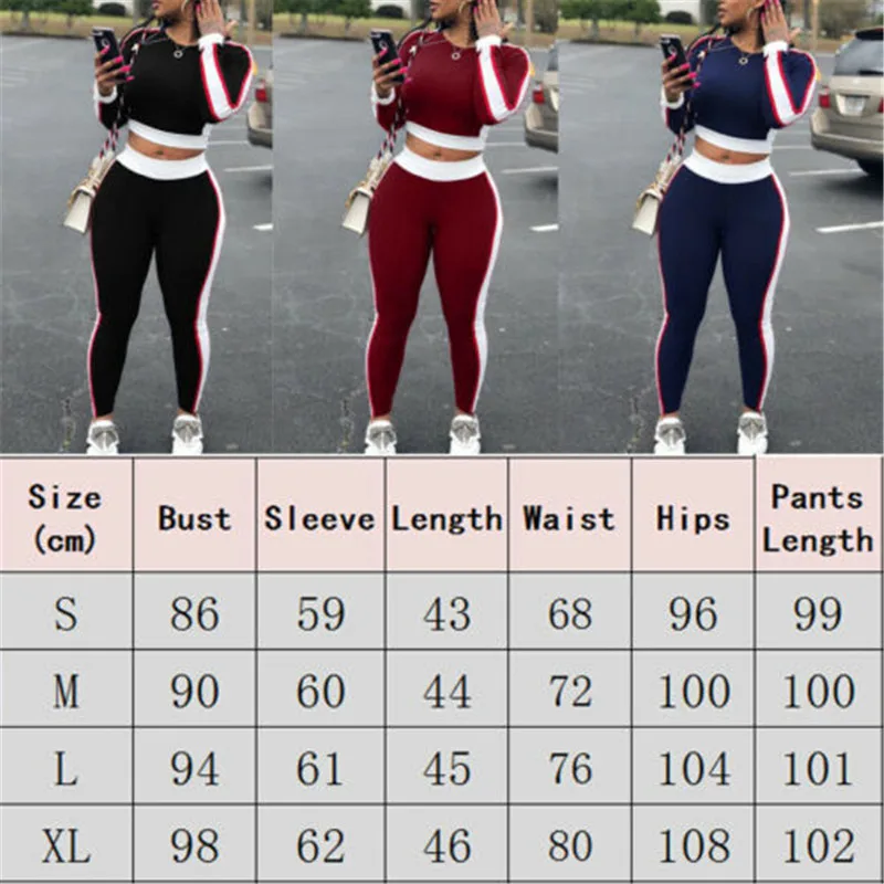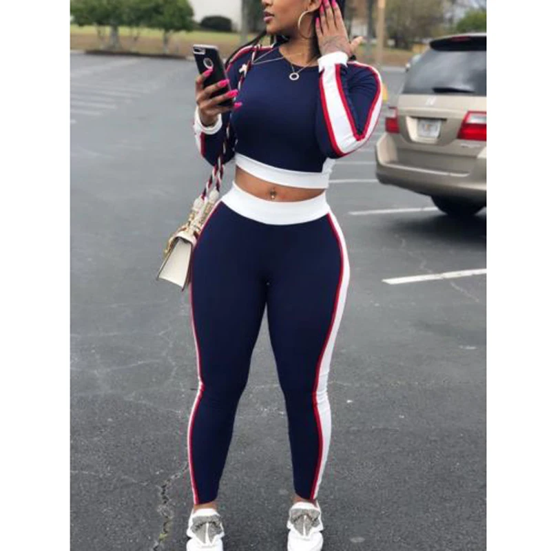 Женский комплект из двух предметов, укороченный спортивный костюм в контрастную полоску с высокой талией, облегающий Женский Топ с длинным рукавом и брюки, однотонный комплект