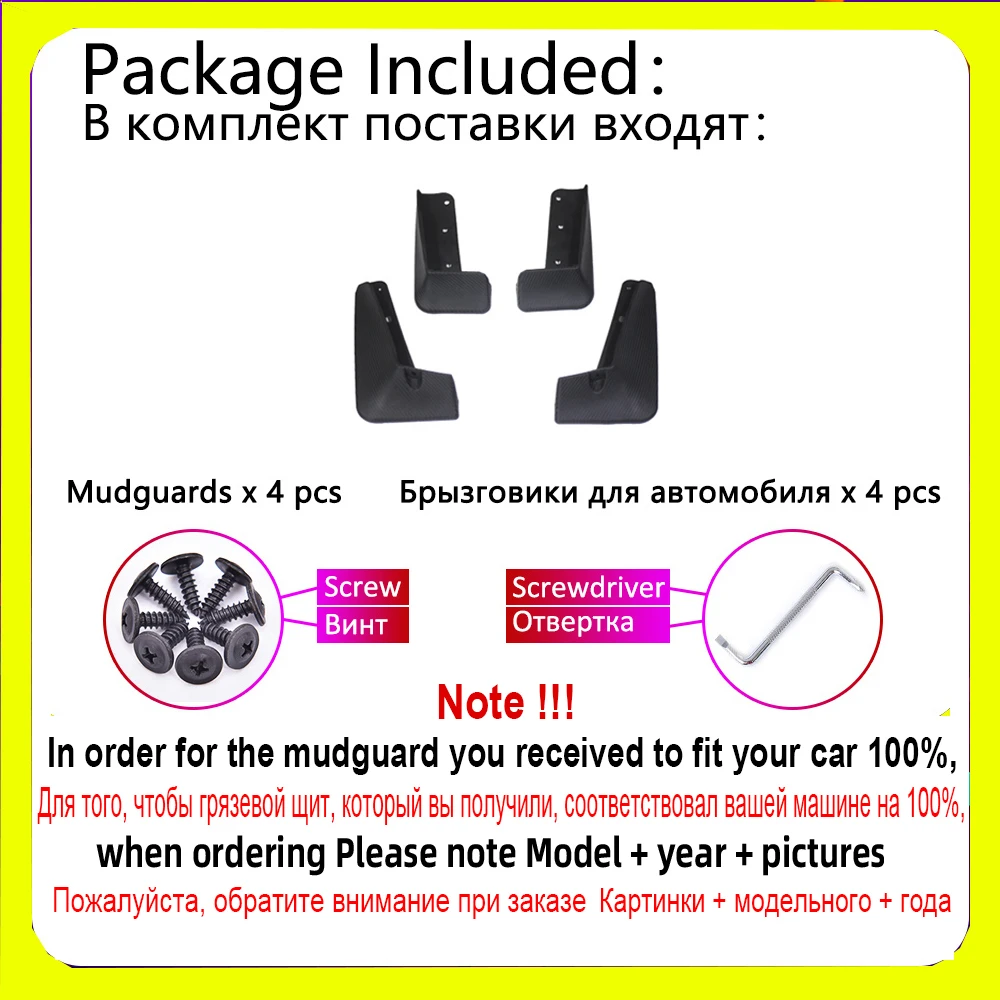 Эти износостойкие грязевые предохранители легко сочетаются с автомобилями и минимизируют риск попадания грязи, дорожных обломков и каменных сколов с передних и задних шин. Обеспечьте дополнительную защиту, улучшая спортивный внешний вид вашего автомобиляИнструкции по установке:1. Автомобиль в нижней части оригинальных винты для автомобилей с гаечным ключом, чтобы отвинтить2. Возьмите Брызговики, хорошее расположение, винты установлены3. Винты установлены в соответствующем отверстии на брызговиках.