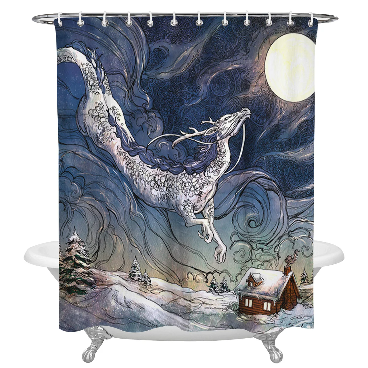 Снежный пейзаж Дракон Луна искусственная ткань декор для ванной комнаты душевая занавеска набор с крючками украшение для дома