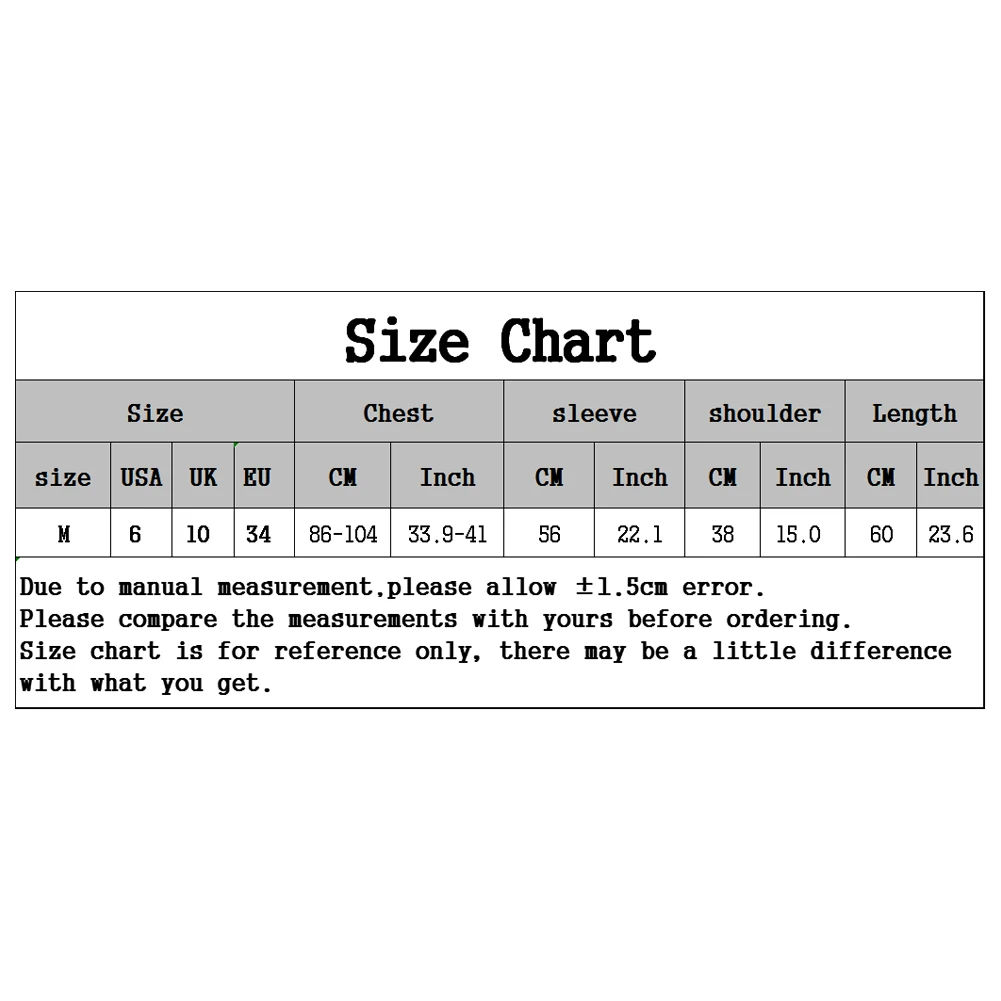 Размер: длина: 60 см/23,6 дюйма, обхват груди: 86-104 см/33,9-41 дюйм, рукав: 56 см/22,1 дюйма, Плечи: 38 см/15,0 дюйма (прибл.)