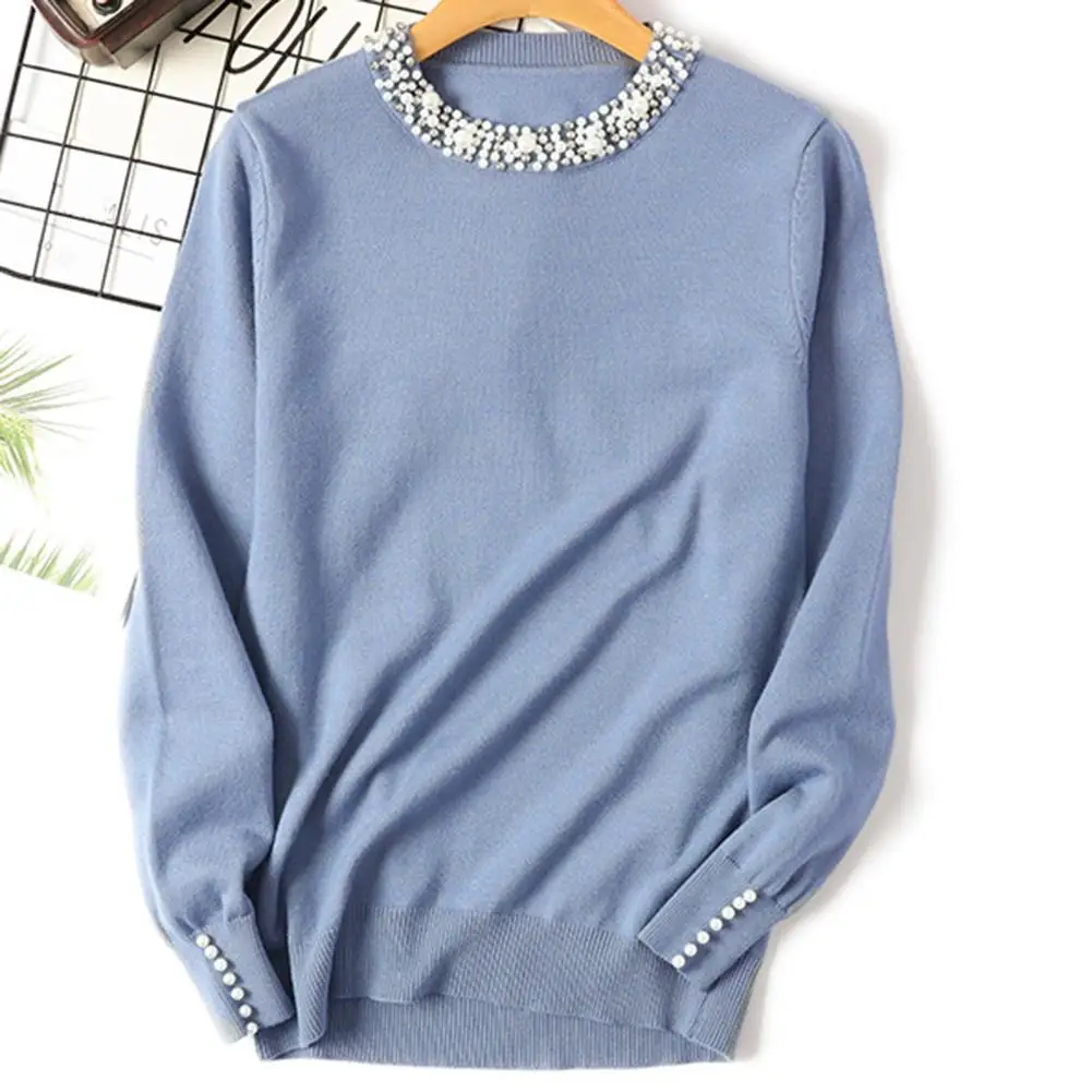 Модный Однотонный свитер с круглым вырезом и бисером, женский свободный вязаный Топ