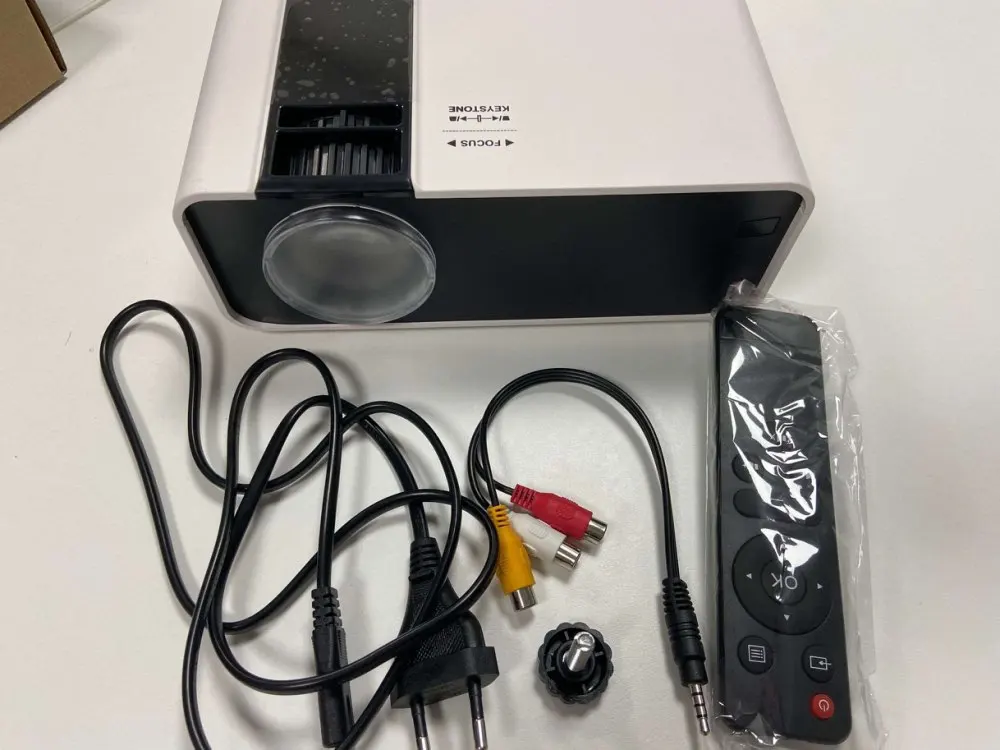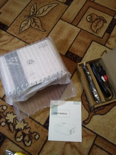 Пришёл быстро по России через CDEK. В комплекте инструкция, пульт, кабель силовой. От доставки не пострадала ни упаковка, ни сам проектор. Качество не офигенное, но нормальное, расстояние до проектора 2 метра, видно сетку матрице на картинке если ближе подойти, с далека норм. Для супербюджетного проектора пойдёт качество. Звук тоже неплохой, присутствуют настройки. Детям понравился. Углы настраиваются, лучше можно линзу крутить и програмно в меню настроить. Яркость хорошая.