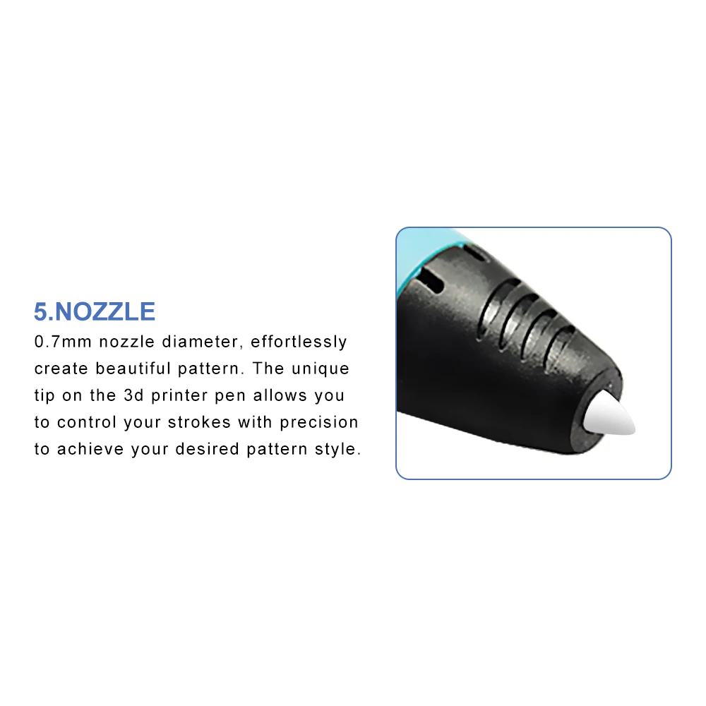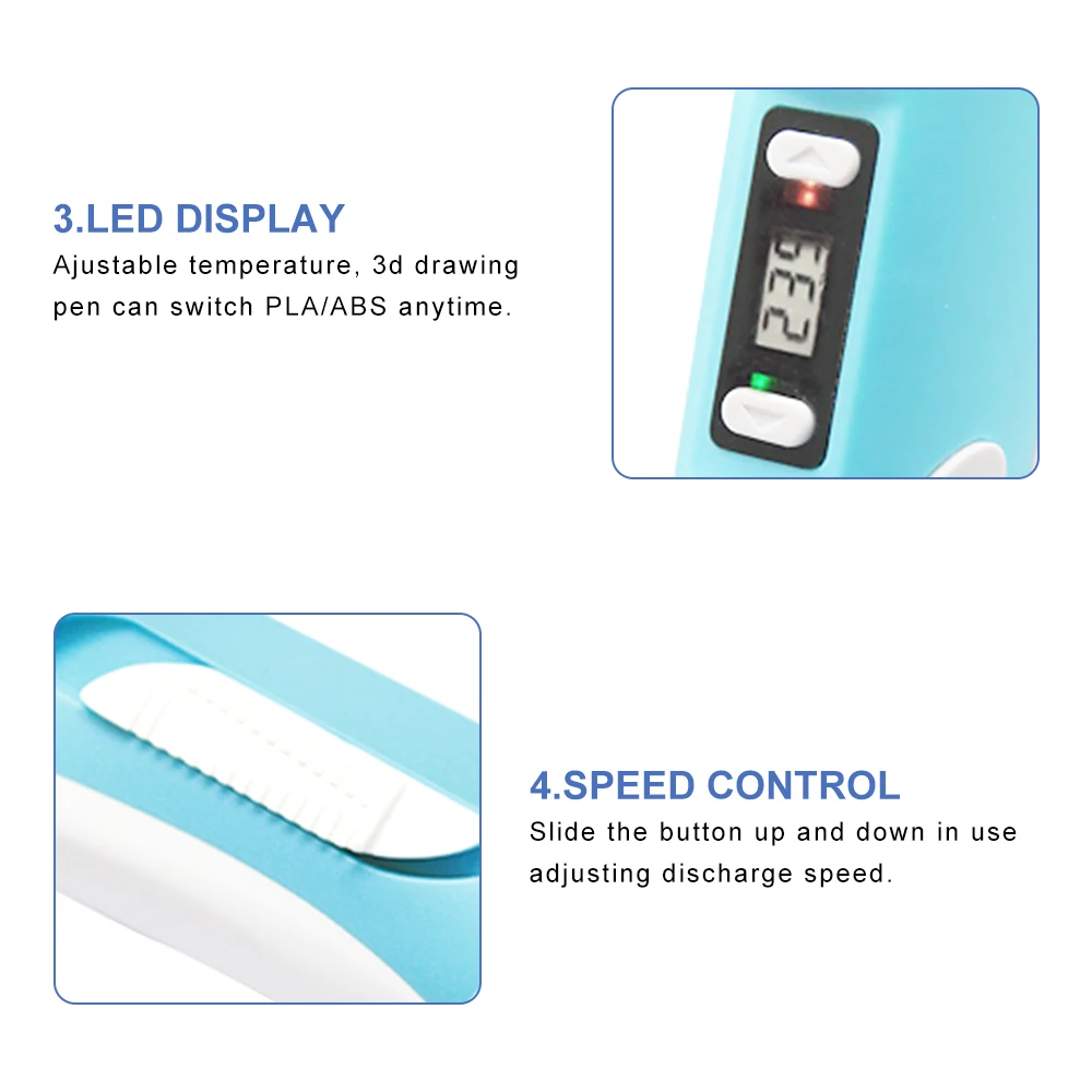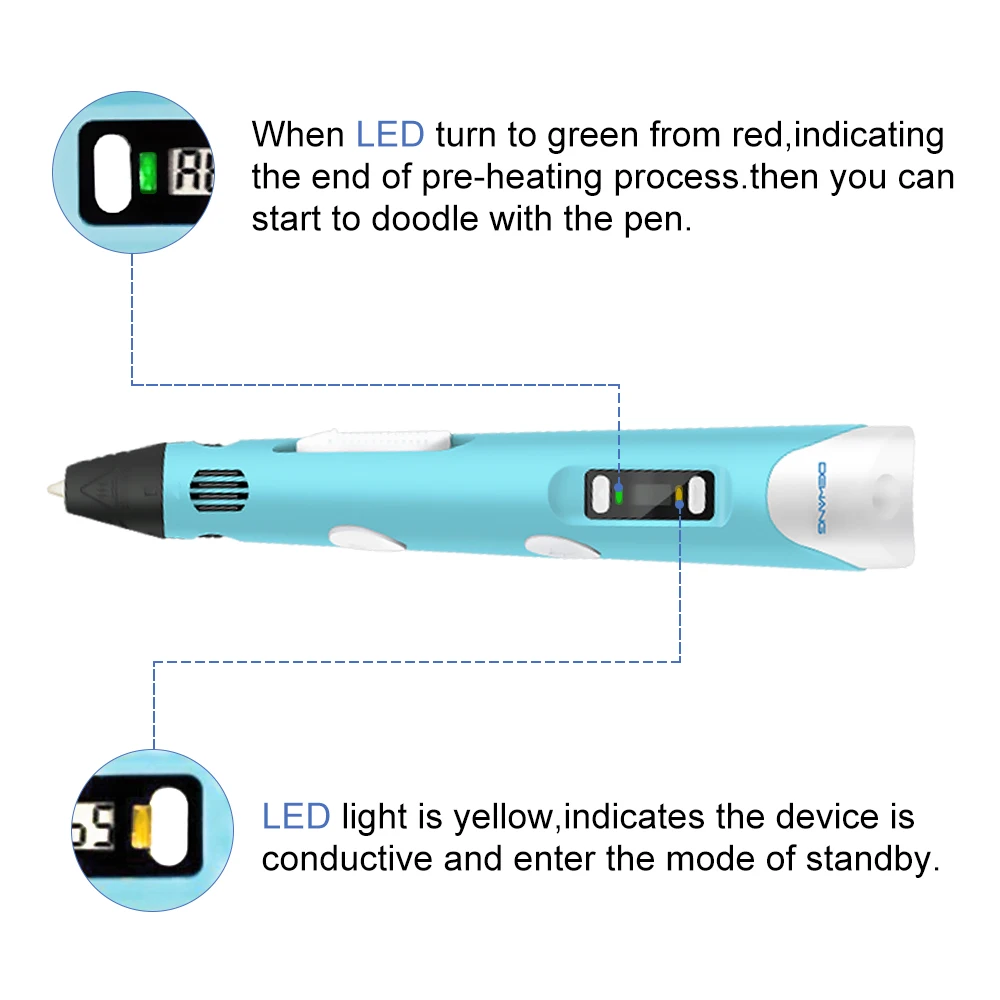 Ультра безопасно!DIY 3D печатная ручка прошла сертификацию CE/RoSH/FCC/EN71.Подарок на день рождения для детей3d-ручка-лучший подарок для детей на день рождения. 3D Ручка-это отличный школьный подарок, который отправляется однокласснику.Обратная связь в реальном времени!Светодиодный экран на 3d-ручке способен особенно быстро отображать температуру тока.Регулируемая скорость печати!Включите регулировку скорости, сползая соответствующую кнопку.Автоматический спящий режим!3d-ручка для детей автоматически переходит в спящий режим, если вы не используете ее в течение 2 минут или дольше.Простой в использовании!Желтый свет показывает мощность. Нажимаемый переключатель накаливания. Красный свет для режима нагрева, когда красный свет поворачивается к синему, показать Предварительный нагрев закончен.