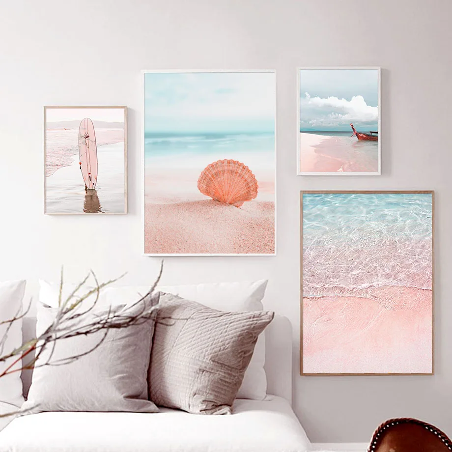 Скандинавский розовый морской пейзаж, Пляжная ракушка, зонтик, лодка с листьями, Постер и принты, настенная Картина на холсте для домашнего декора