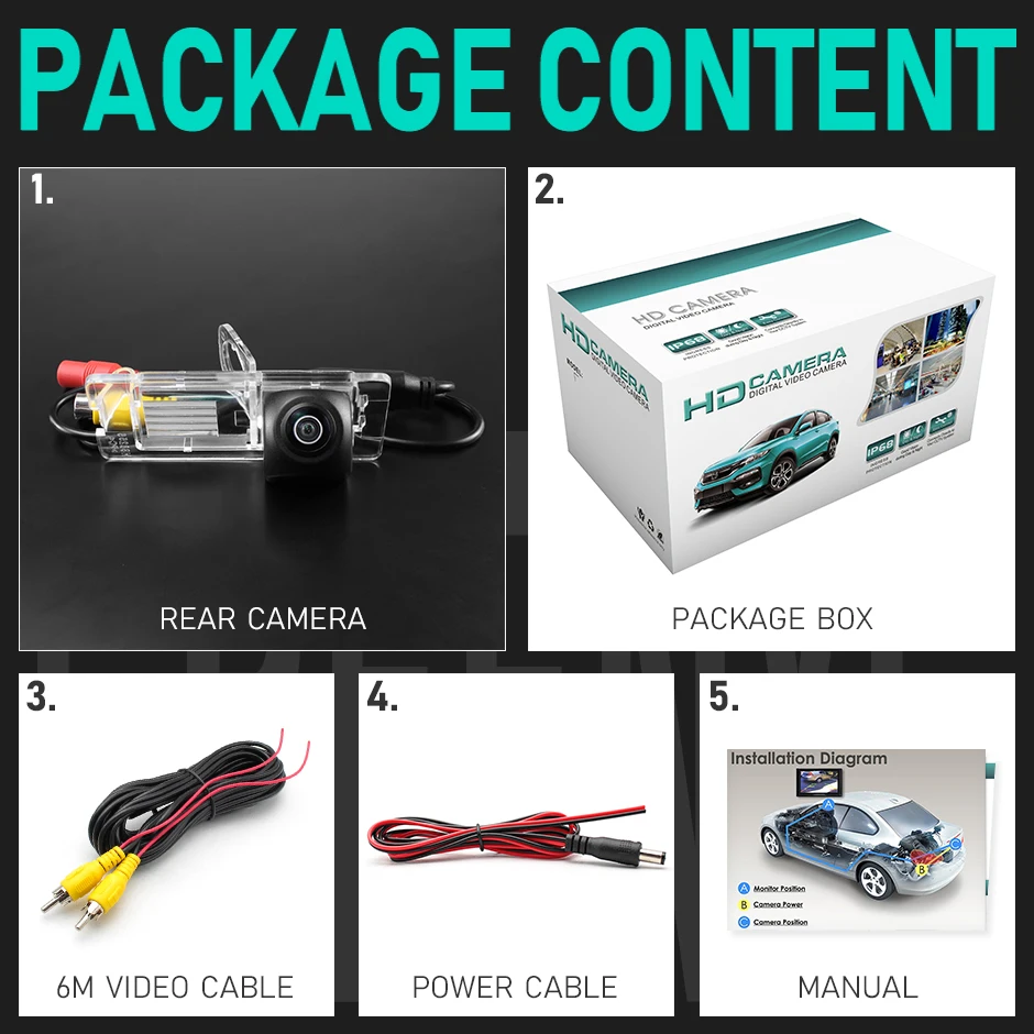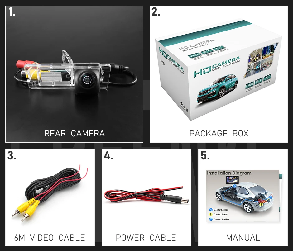 1. Задняя камера2. Коробка для посылка3. Видео кабель (6 м)4. Кабель питания5. Руководство пользователя
