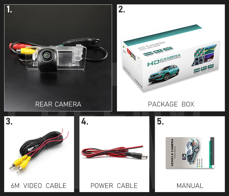 1. Камера заднего вида2 посылка вочная коробка3. Видеокабель (6 м)4. Кабель питания5. Руководство пользователя