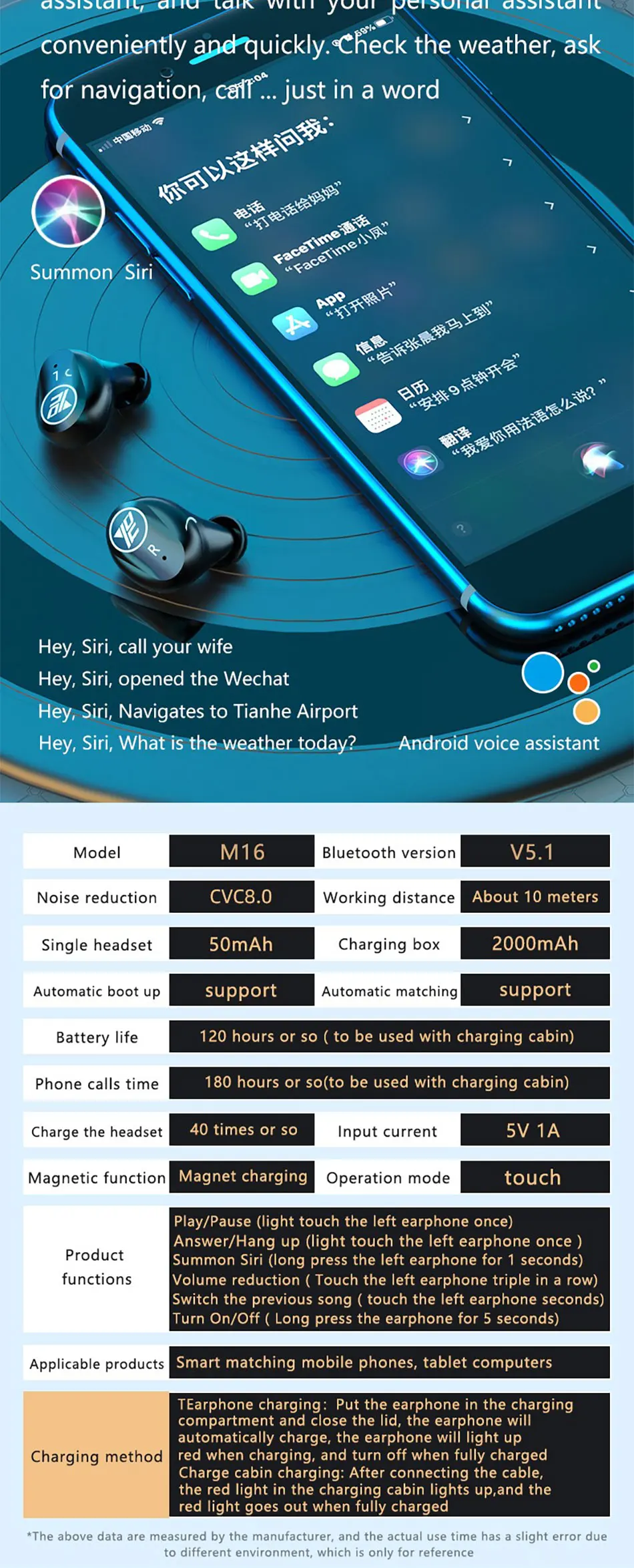 TWS M16 Bluetooth 5,1 наушники 2000 мАч зарядная коробка беспроводн...