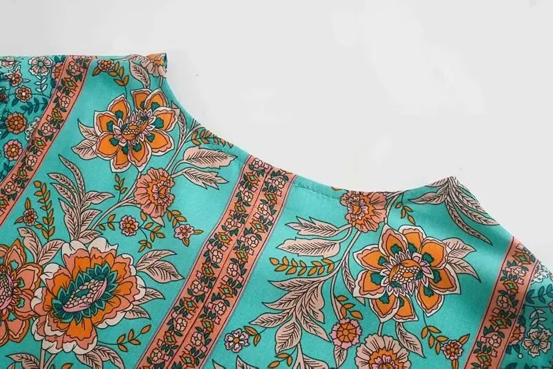 Винтажная шикарная женская зеленая богемная блузка с цветочным прин...