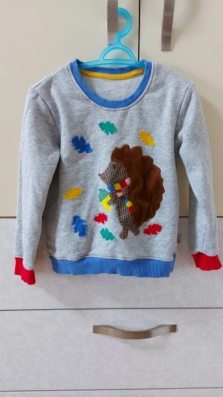 Свитерок отличного качества, ткань плотная хлопок, брала внуку на 3 годика,немного большеват, на зиму будет как раз, сейчас ребёнку 2,5 годика,размерная сетка точная, доставка в Израиль быстрая всего 15дней,ёжик и листочки материальные, пришиты.спасибо большое продавцу, покупкой очень довольная, рекомендую продавца и его магазин. Хочу сказать, что магазин брендовый, продавец очень порядочный и отзывчивый, покупаю постоянно в этом магазине и у этого продавца.