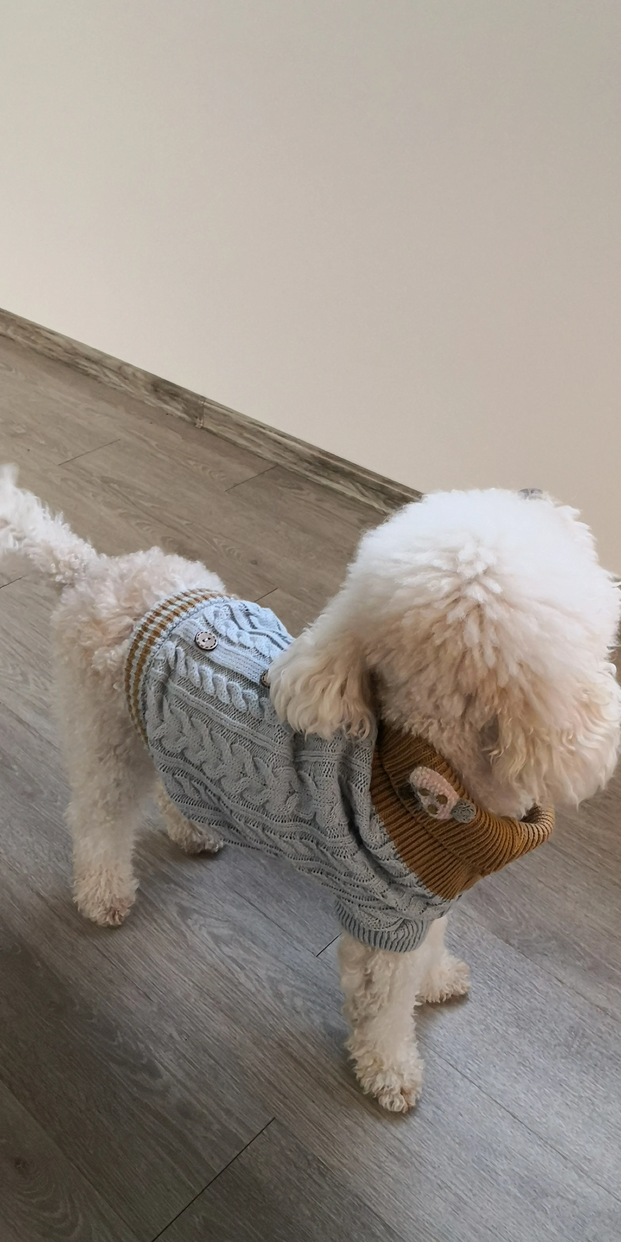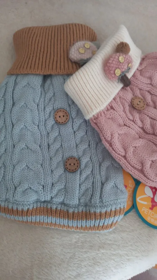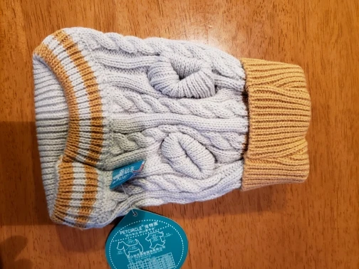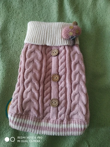 Свитер очень хороший, мягкий, но на картинке немного не соответствуют цвета (голубой немного бледнее и вместо ярко горчичного - бледно-коричневый). И неприятный запах (проветрился за два дня). Немного коротковат, чуть ниже половины спины, но думаю, это такой фасон. В целом, симпатичный. Идеально подошел для кошек 3,5кг и 4 кг.