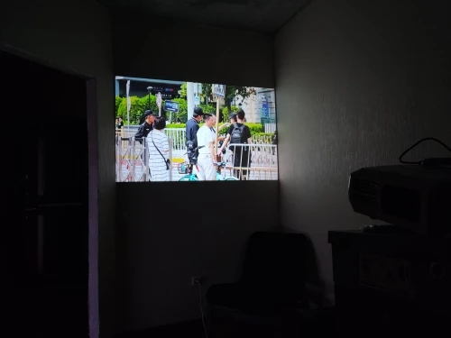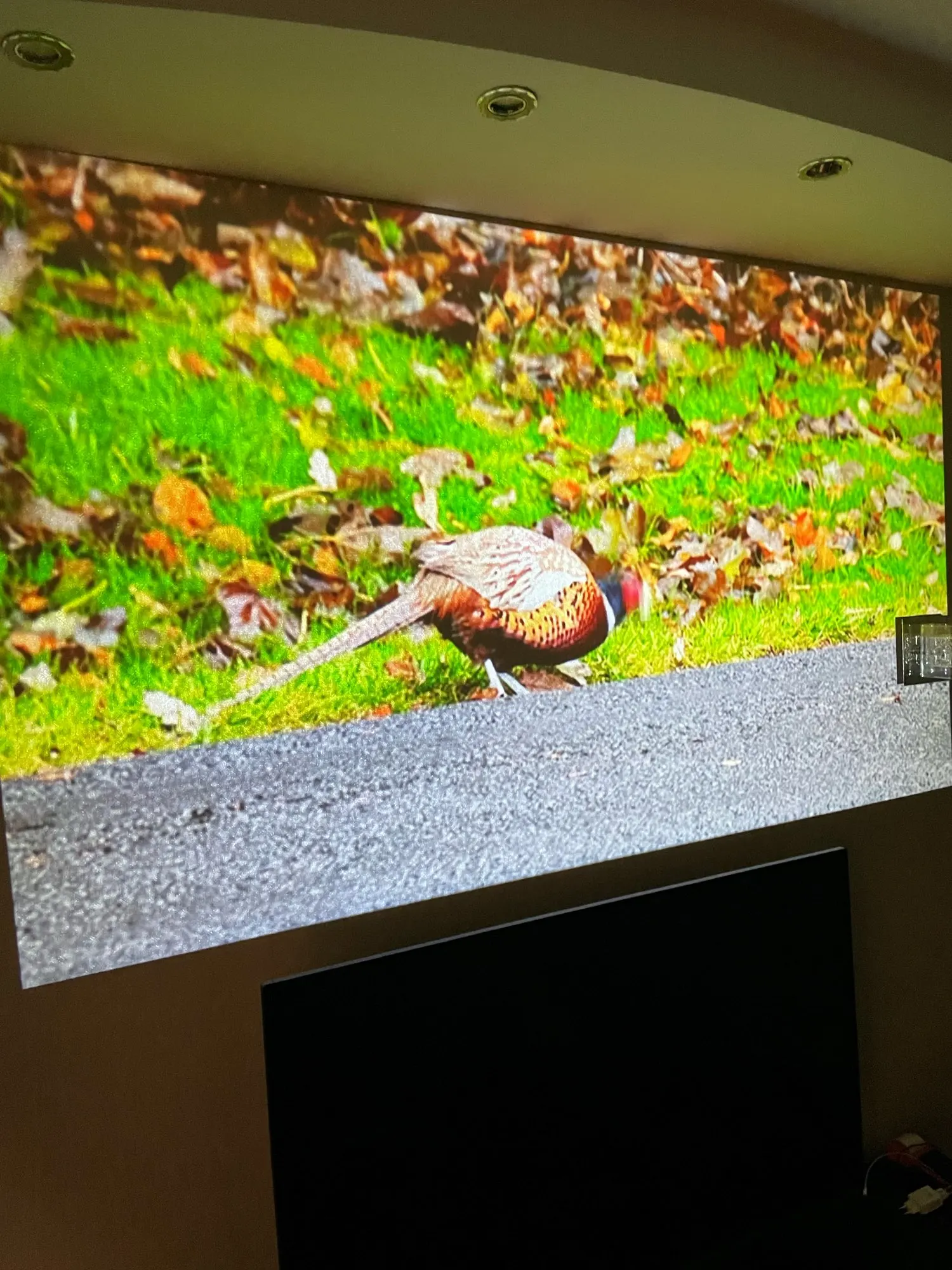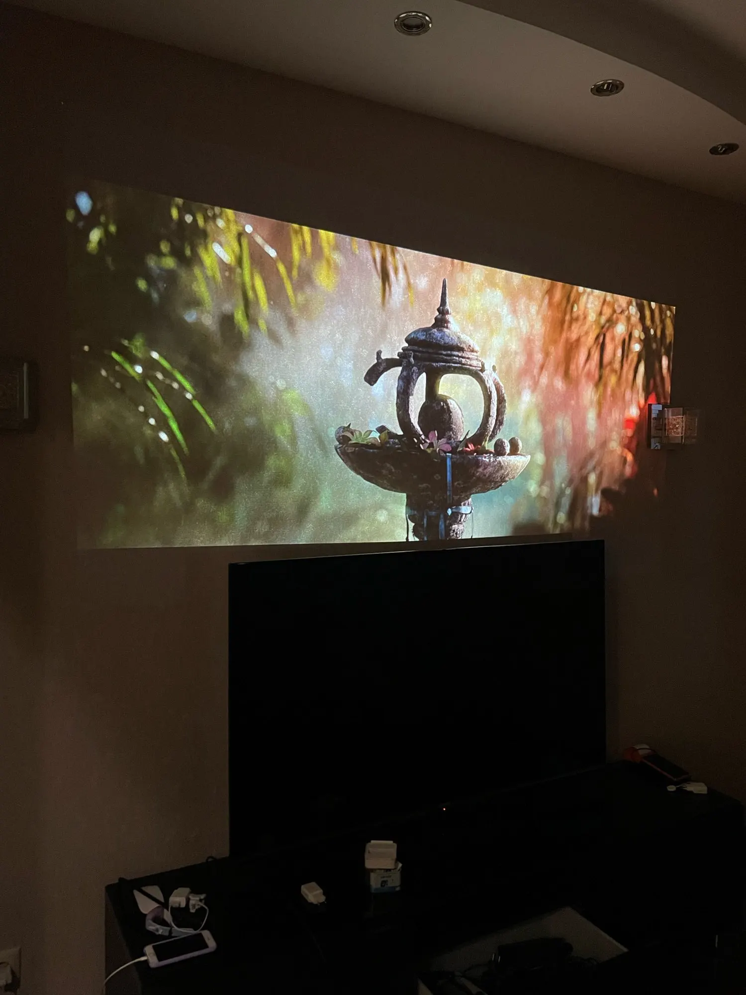 пришло за 4 дня до Башкирии. это мой первый проектор, сравнивать несчем. но проектор очень нравится. заказал в максимальной комплектации, тв бокс с 11 андроид довольно шустрый, подключил через вай-фай - летает, аэромышь классная вещь. крепление не маленькое, но вполне сносное, внутри трубки квадратного сечения как раз проходит HDMI кабель и кабель питания в гофре 16мм. кабель питания удлинил и вывел над подвесным потолком к розетке в стене. проектор шумноват, но когда смотришь что-то в принципе не слышно его. планируется что он будет находится от зоны просмотра в 2-2.5м, так что с шумом проблем не будет. динамики штатные по громкости наверно как в телевизоре, буду докупать блютуз колонку. первые три фото, проекция на серые обои ночью, последние две солнечным днём. купил для него экран диагональю 126 дюймов, такая диагональ достигается на отделении от экрана на 3.9м. посмотрим сколько будет служить.