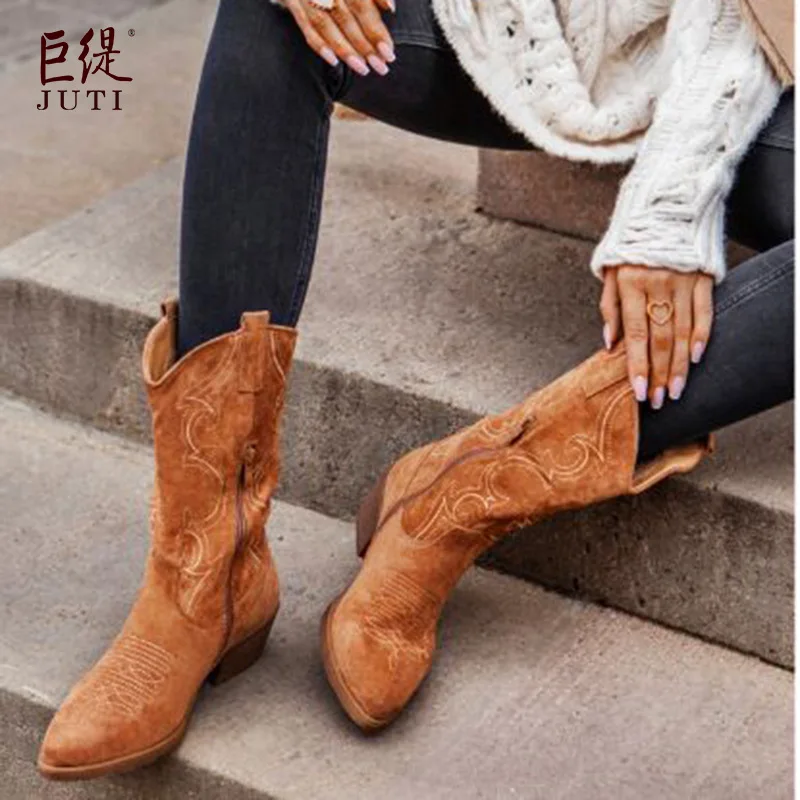 Женские ковбойские ботинки на плоской платформе, кожаные ботинки на меху, модные ботинки с круглым носком на высоком каблуке, Осень-зима