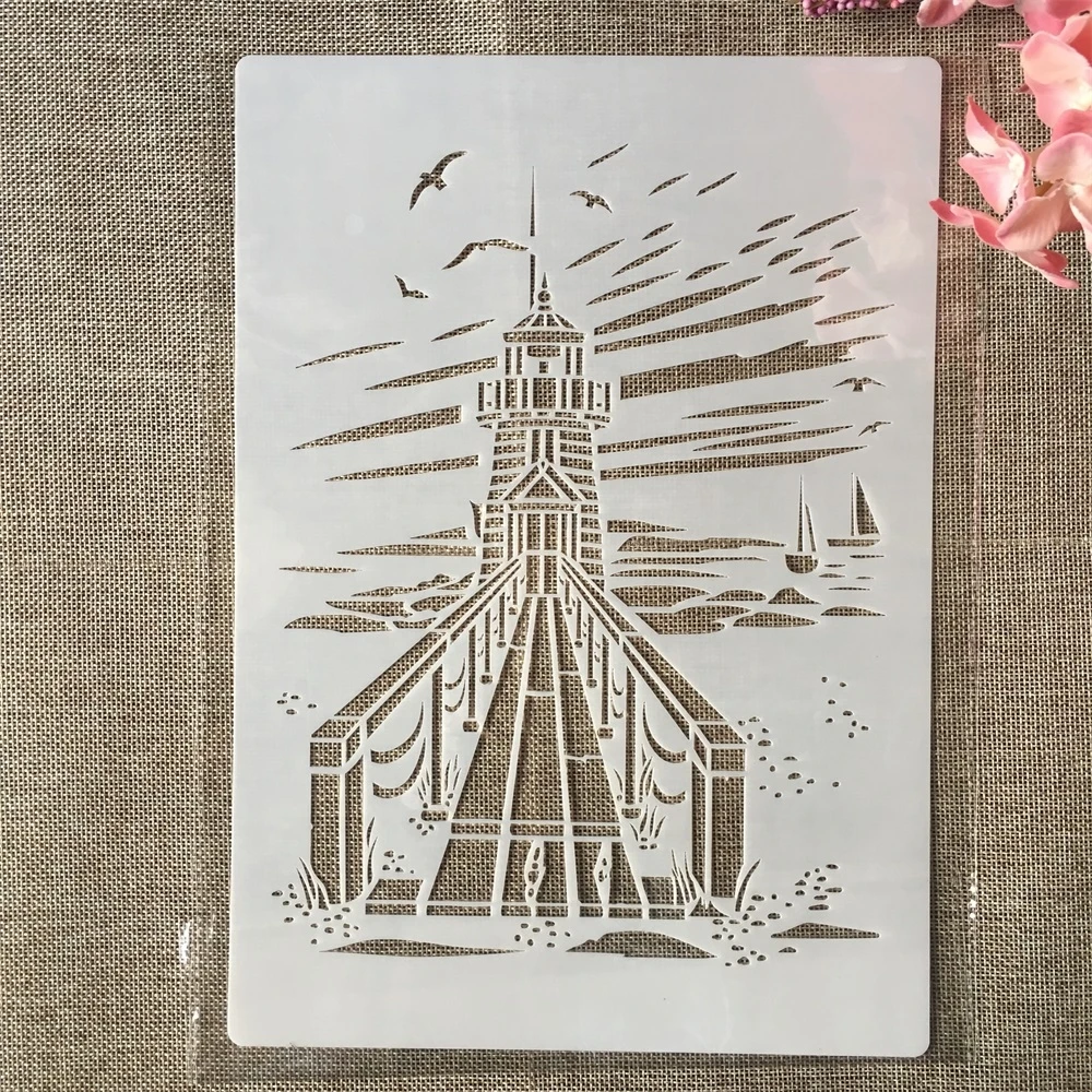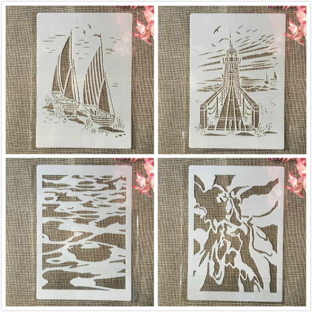 4Pcs A4 29cm Sailboat Lighthouse Iceberg DIY Layering Stencils Painting Scrapbook Coloring Embossing Album Decorative Template