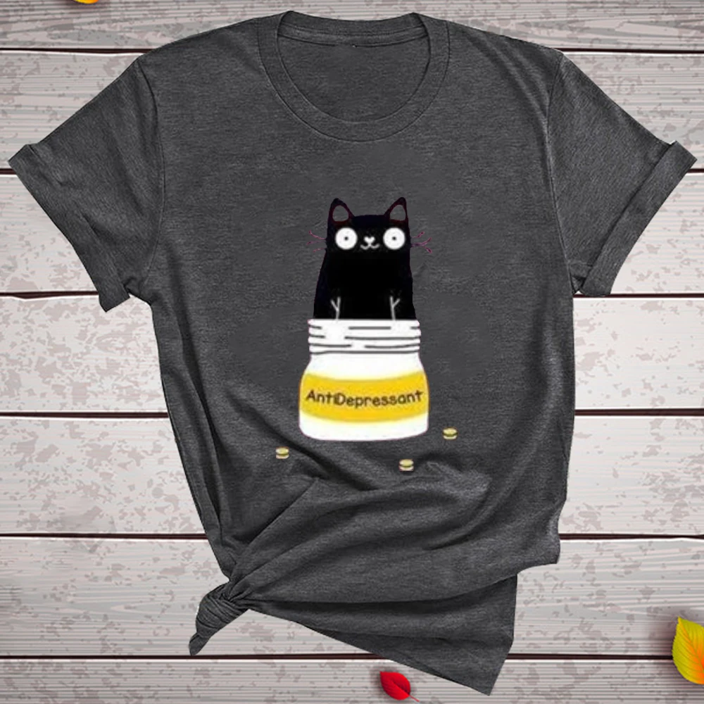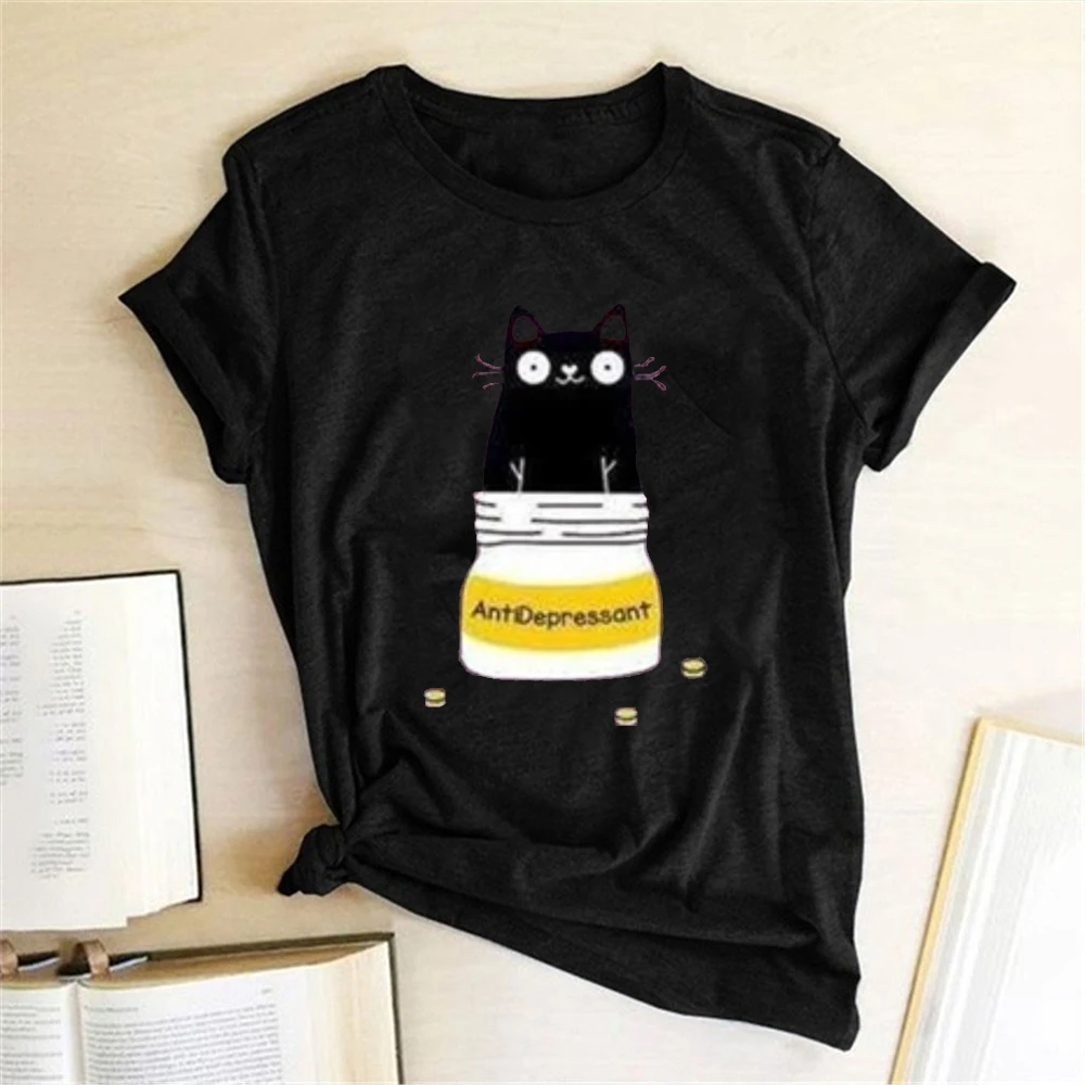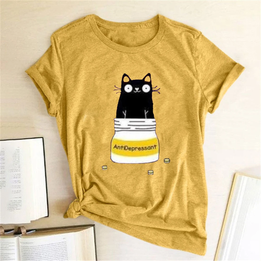 Бутылочка для кошек, футболки с изображением антидепрессанта, женская летняя футболка с графическим принтом 2020, повседневная одежда Harajuku, топы с круглым вырезом для женщин и девушек
