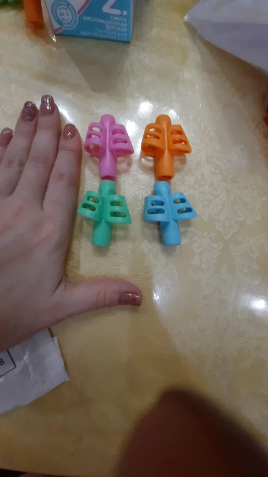 Удобные держатели. Заказал 4шт. Для моих пальцев не подходит, но для 7-ми летнего ребёнка, самое то. Быстрая доставка, около 20 дней. Посмотрим в дальнейшем.