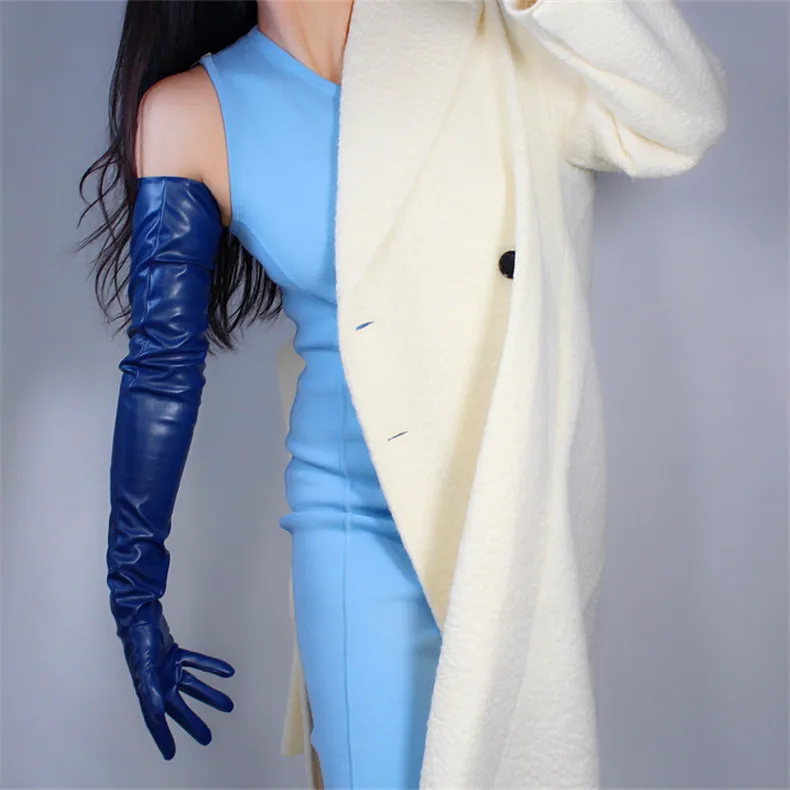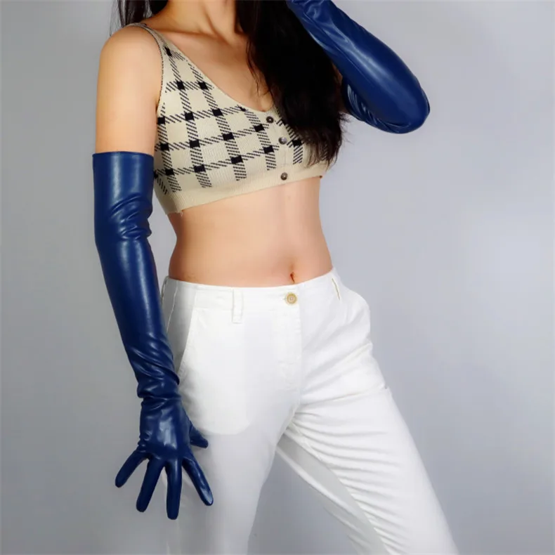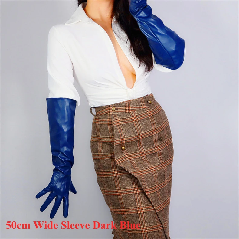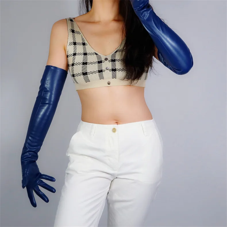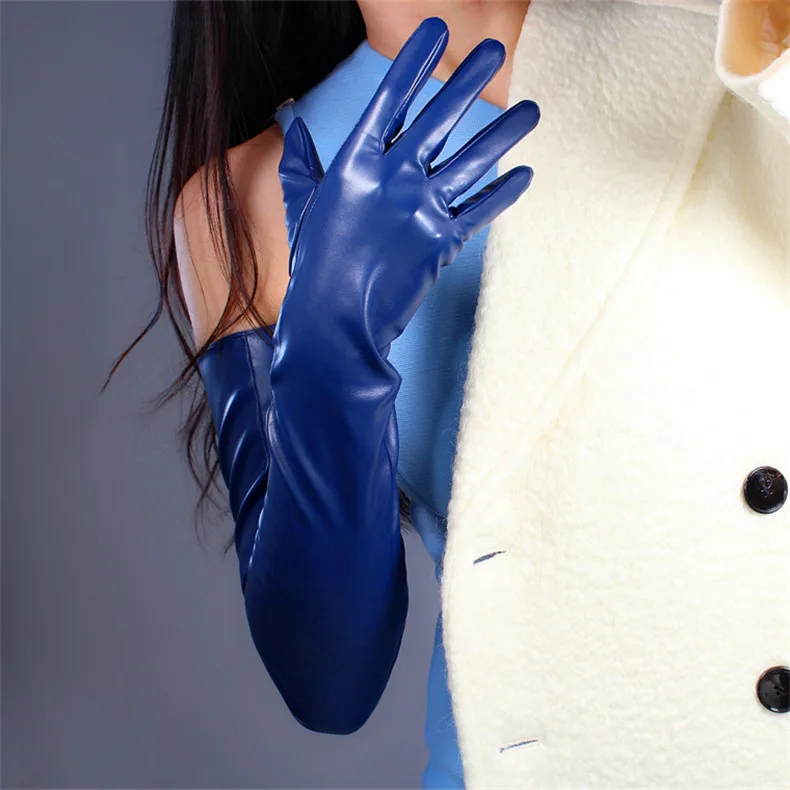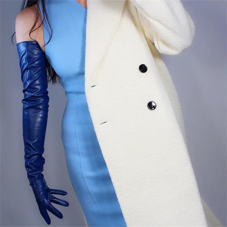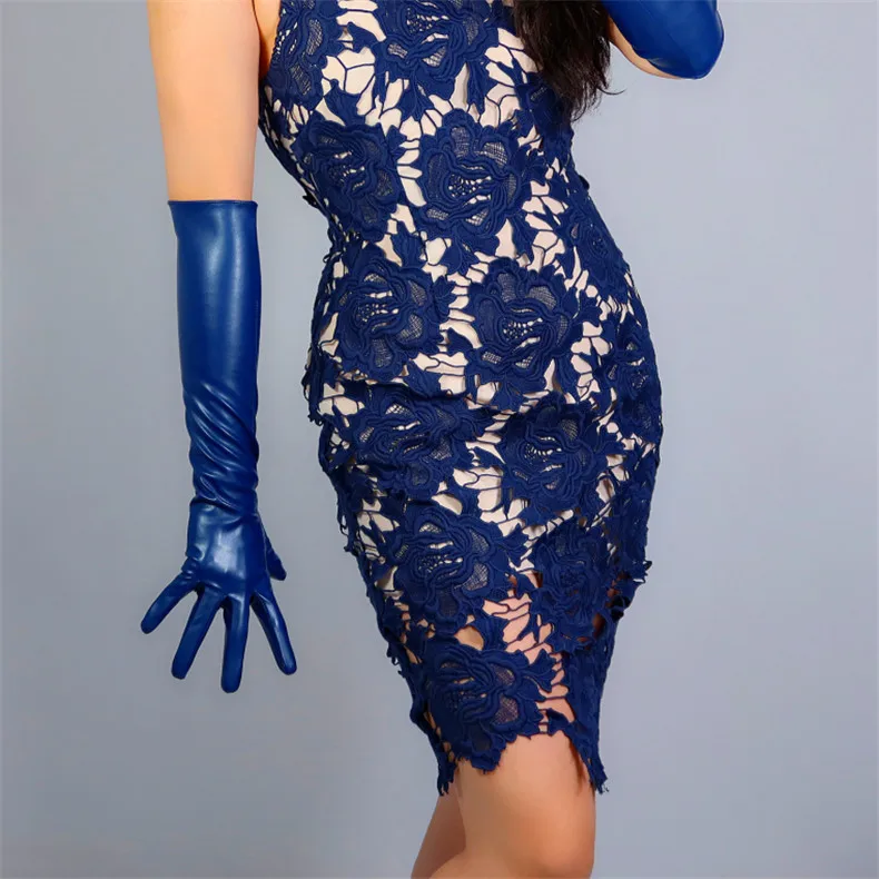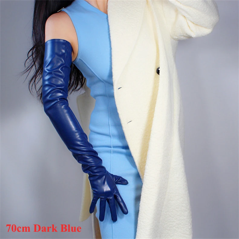 Удлиненные Модные женские перчатки из искусственной кожи, овчины, искусственной кожи, 28 дюймов, 70 см, Вечерние кожаные перчатки для женщин, синие, темно-синие