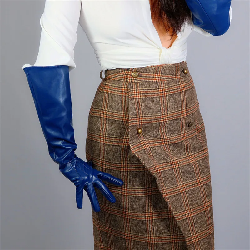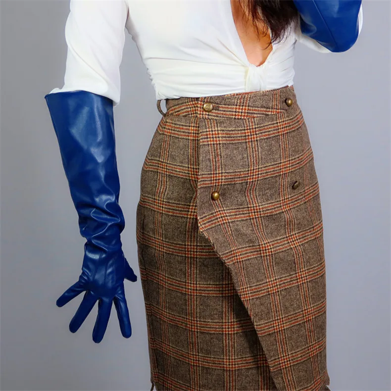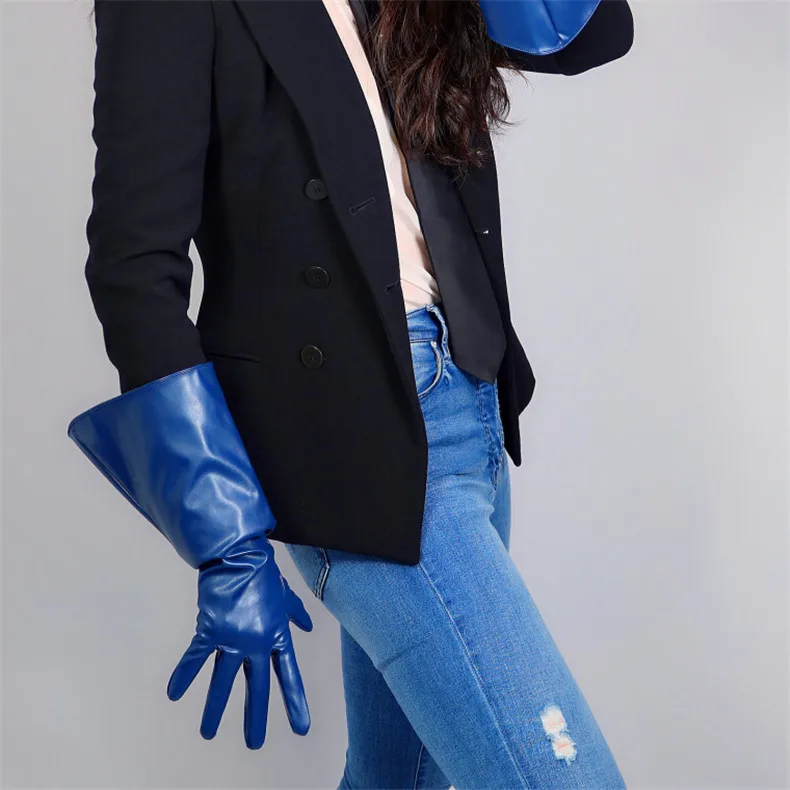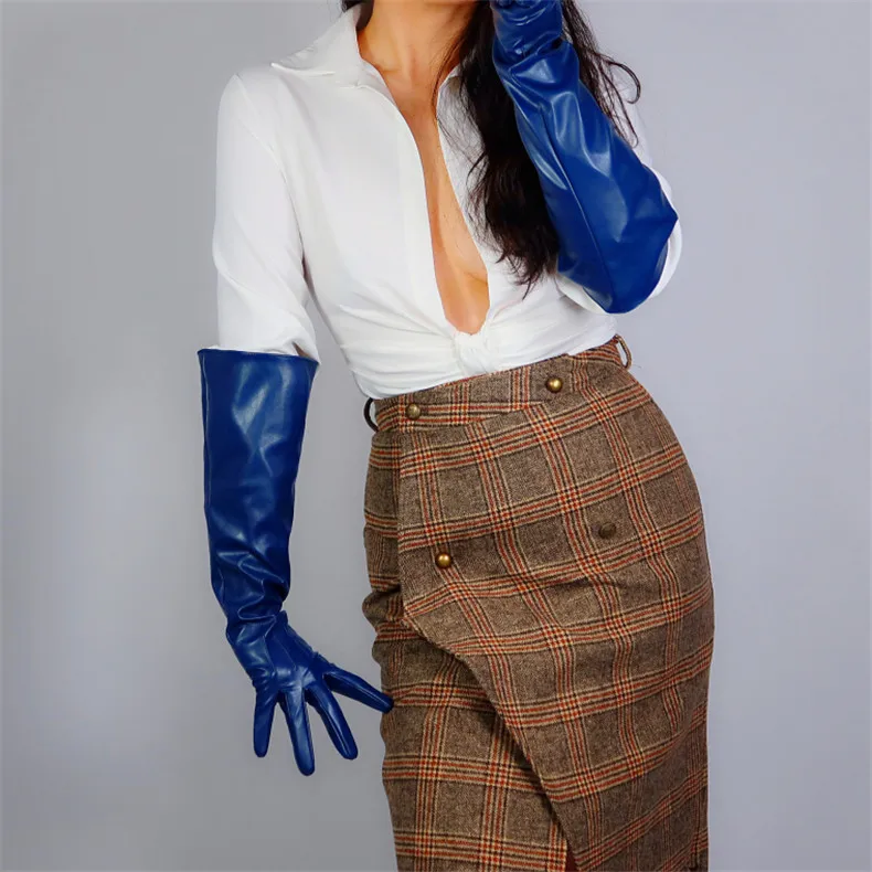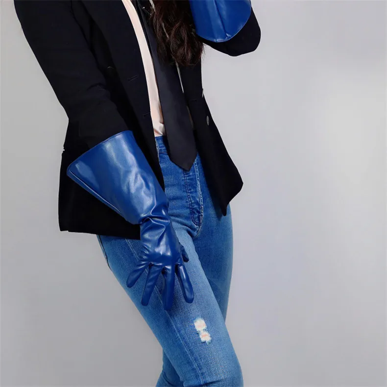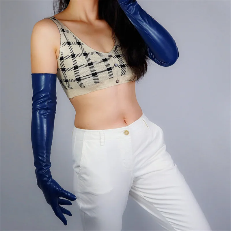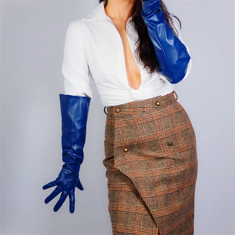 Удлиненные Модные женские перчатки из искусственной кожи, овчины, искусственной кожи, 28 дюймов, 70 см, Вечерние кожаные перчатки для женщин, синие, темно-синие