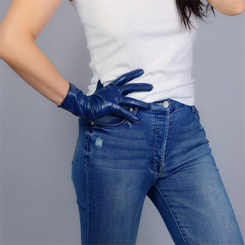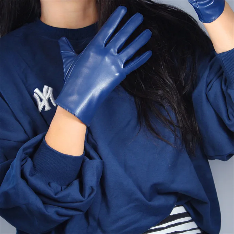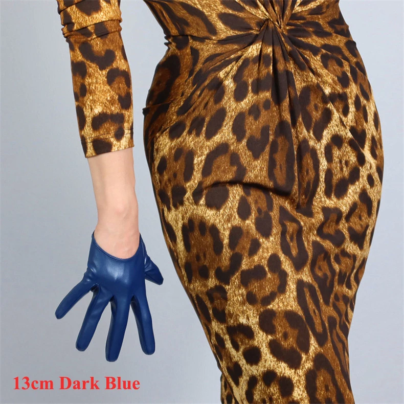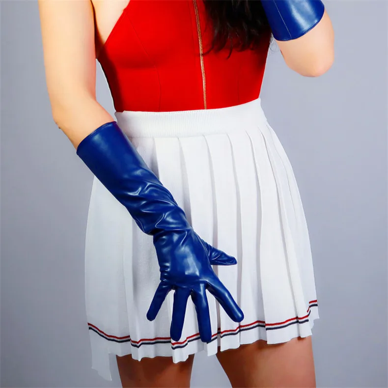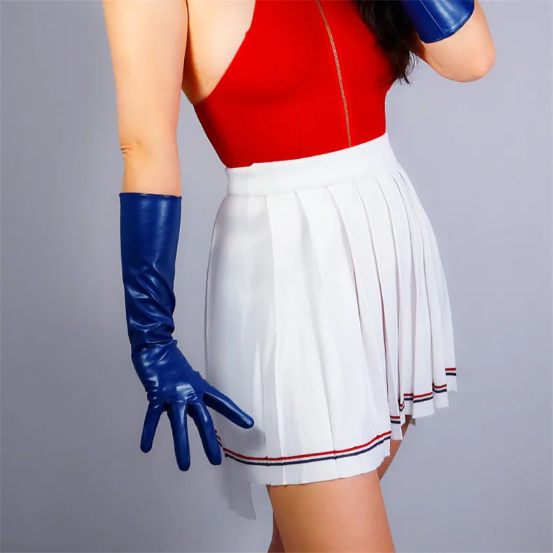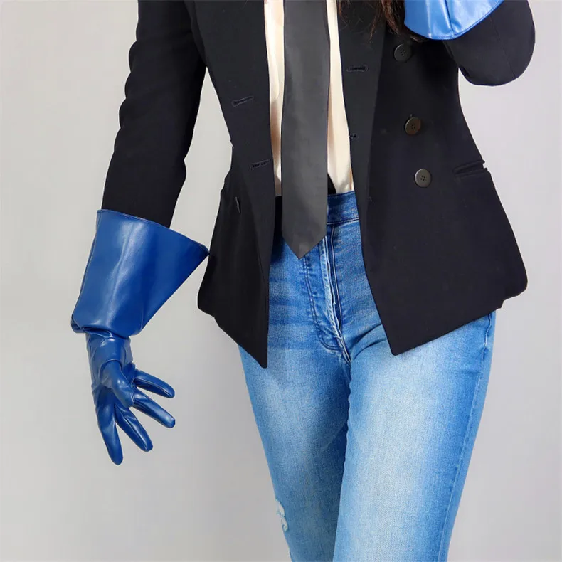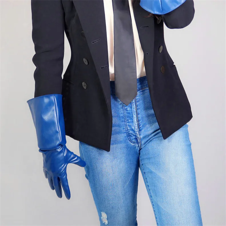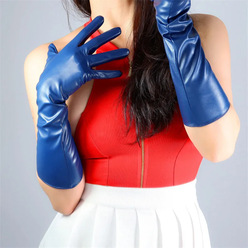 Удлиненные Модные женские перчатки из искусственной кожи, овчины, искусственной кожи, 28 дюймов, 70 см, Вечерние кожаные перчатки для женщин, синие, темно-синие
