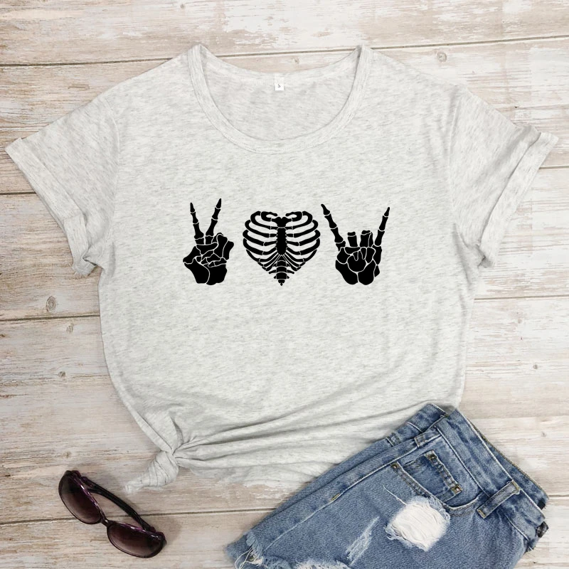 Футболка Peace Love Rock, смешная музыкальная радиология, футболка со скелетом, саркастическая женская футболка с коротким рукавом, с рисунком хиппи, готические черные футболки, топы