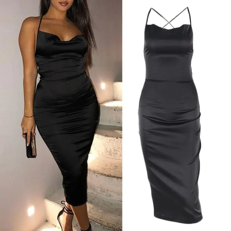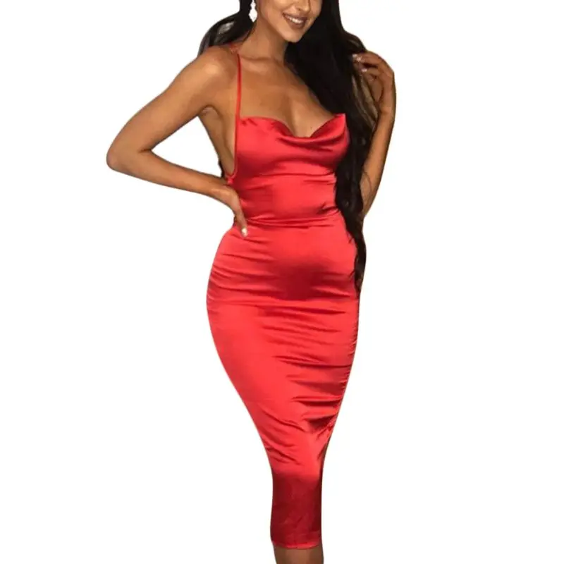 Женское атласное платье-миди без рукавов, с лямкой на шее