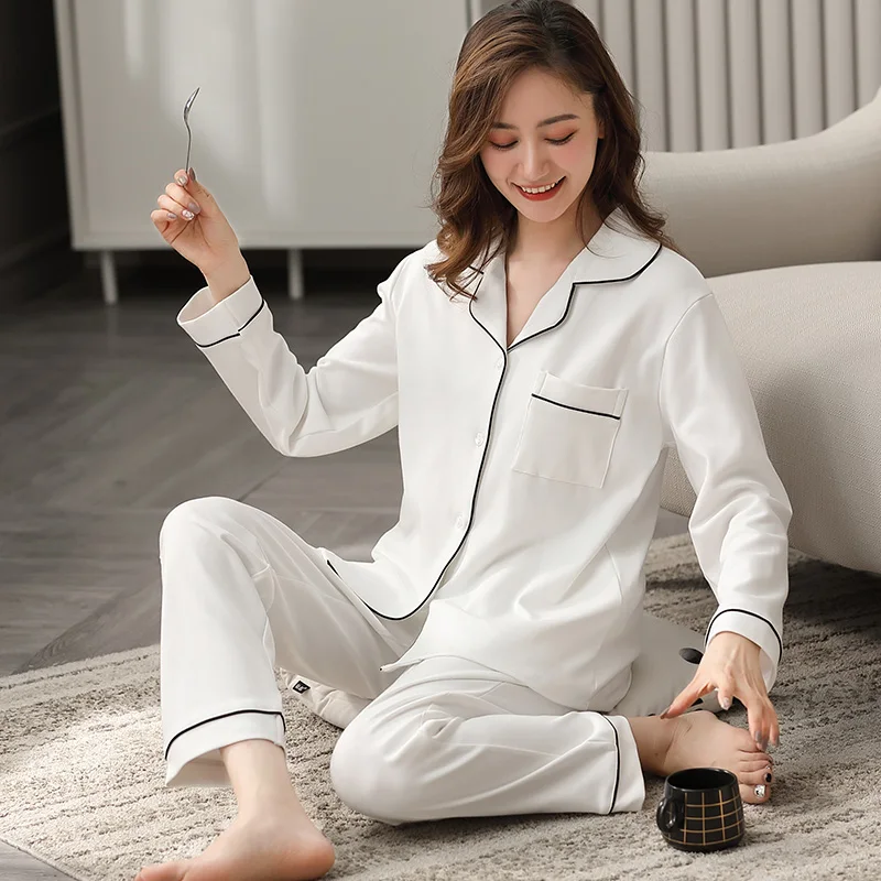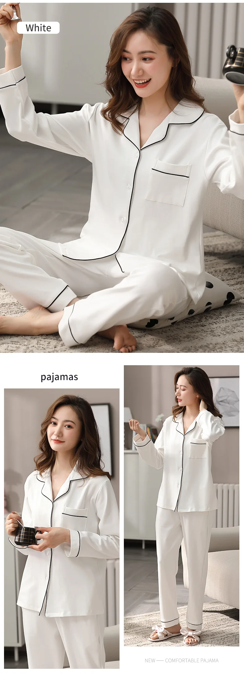 Зимняя пижама из 100% хлопка для женщин, осенняя однотонная белая п...