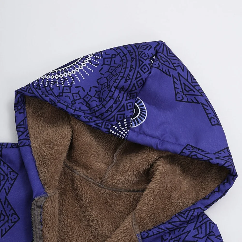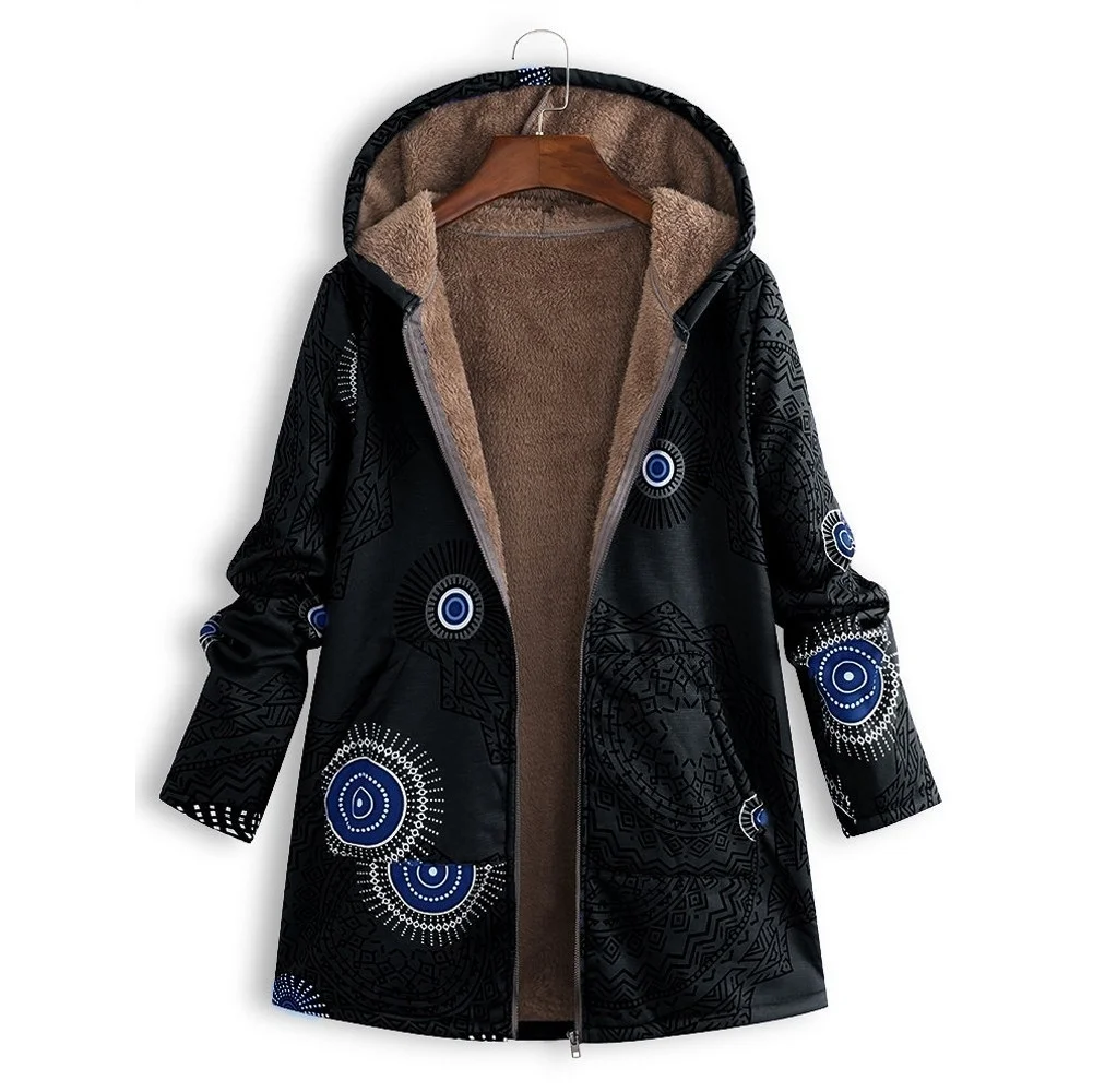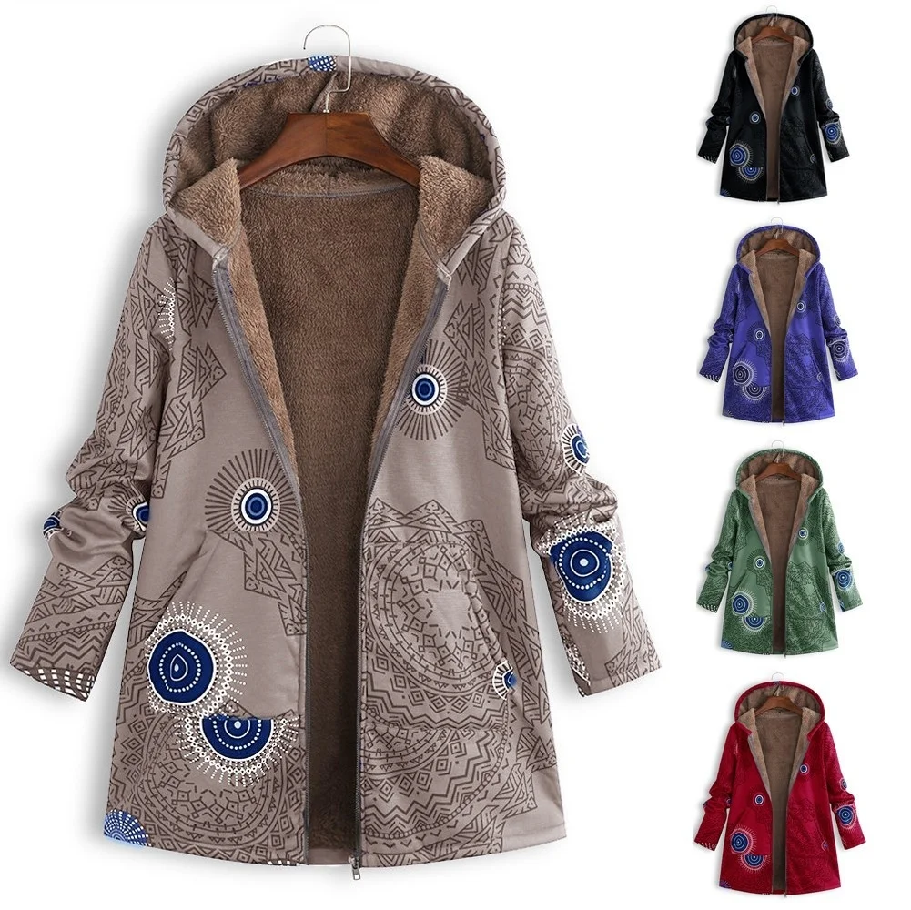 Женское пальто с принтом, зимнее теплое винтажное пальто с карманами, пальто с капюшоном, Женская Повседневная Верхняя одежда, флисовая куртка размера плюс