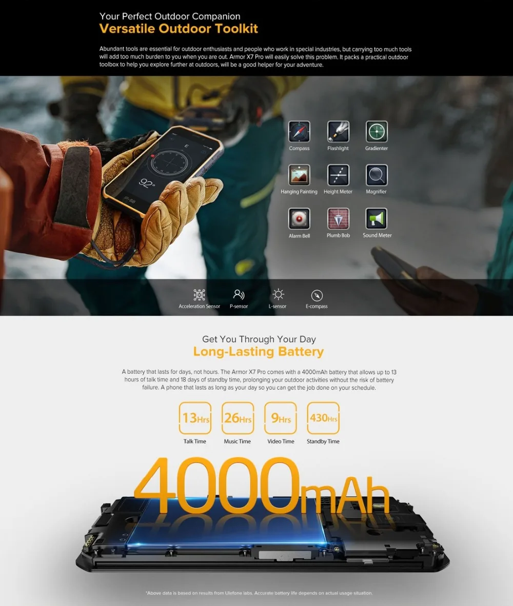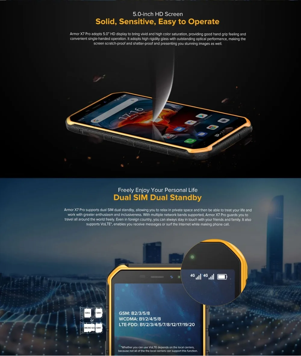 1. MTK MT6761VWE 4 ядра 64-бит до 1,8 ГГц Процессор, хорошая производительность, работает быстро и работать гладко.2. 5,0 дюймов 1280x720 пикселей, высокая четкость, яркие цвета, хорошо подходит для просмотра видео, игр.3. Всесторонняя защита на 360 градусов, прочная и долговечная в использовании.4. Уровень IP68/IP69K водонепроницаемый пыленепроницаемый ударопрочный, он может быть использован в широком использовании сценариев и приложений.5. Питание от литий-полимерного аккумулятора высокой емкости 4000 мАч, длительный срок службы.